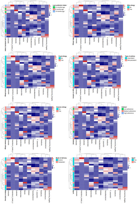 Heatmaps were generated to visualize the distribution and clustering of some clinical and lifestyle variables across subjects. Variables included in the analysis were selected based on their potential influence on gut microbiota composition, such as dietary adherence (KIDMED score), pharmacological treatments, asthma phenotype, and physical activity. Data were previously normalized using z-score transformation. Hierarchical clustering was performed using the Manhattan distance metric and complete linkage method. The resulting dendrograms illustrate the inter-individual similarity patterns based on the multivariate profiles.