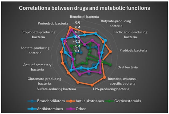 To provide a concise and immediate visualization of correlations between drug use and functional groups of gut bacteria, a radar plot (Figure 9) was generated based on correlation coefficients. This plot allowed simultaneous observation of both positive and negative associations between each drug and bacterial functions, highlighting specific patterns. The radar plot showed that antileukotrienes tended to correlate positively with multiple groups of beneficial and metabolite-producing bacteria, whereas corticosteroids and bronchodilators displayed predominantly negative associations with these groups.