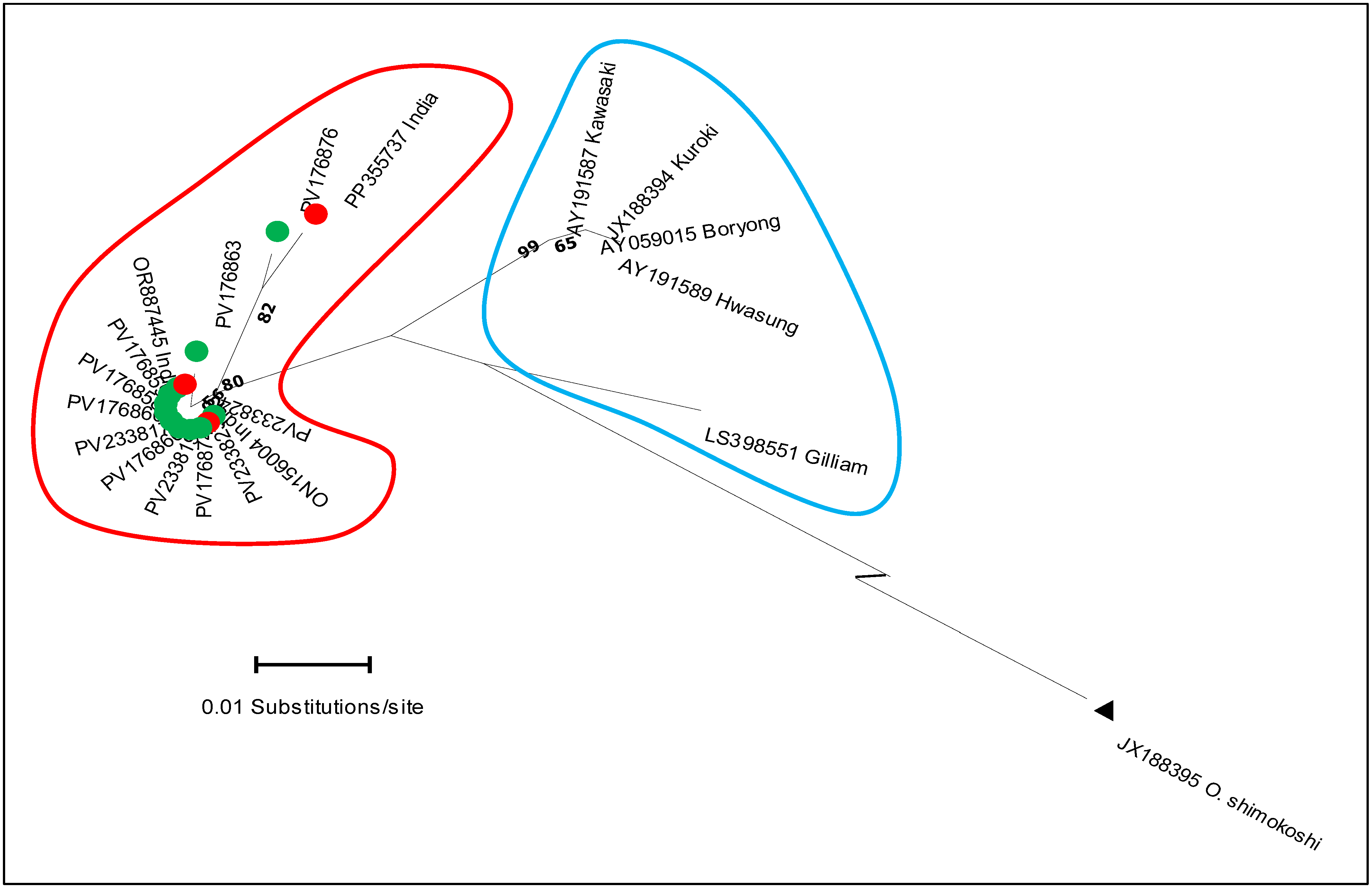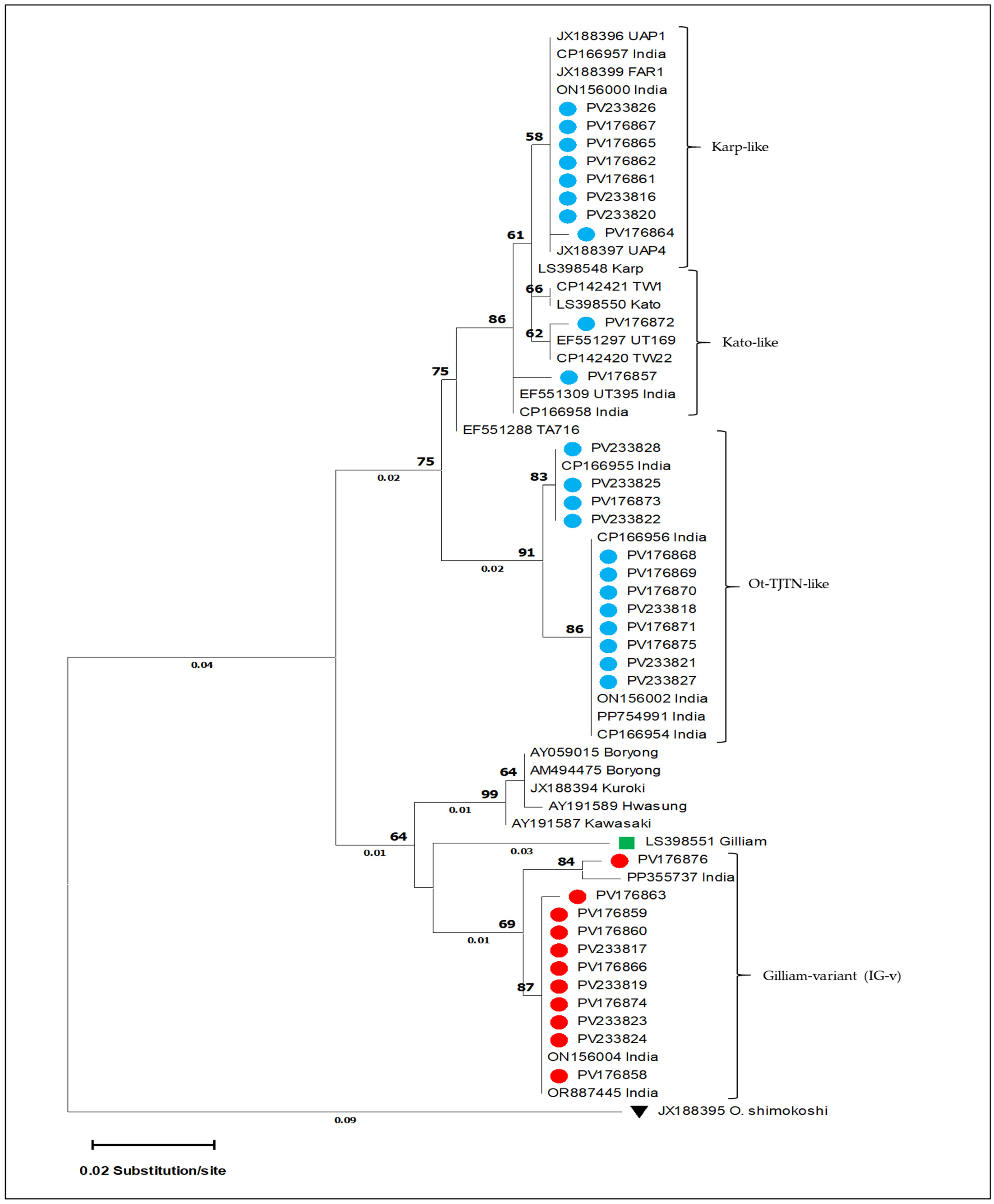 Joseph SV, Nallan K, Rajan G, Murugesan A, Govindarajan R, Sivadoss R, Ramalingam R, Madhumitha RK, Ganesan ST, Jayakumar SK, et al. A New Gilliam Genotypic Variant of Orientia tsutsugamushi in Human Scrub Typhus Cases from South India. Microorganisms. 2025; 13(12):2670. https://doi.org/10.3390/microorganisms13122670