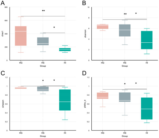 The α-diversity analysis of the mucosal microbiota of rice flower carp. (A) Chao1 index; (B) Shannon index; (C) Simpson index; (D) Pielou_e index. HG: Gill; HS: Skin; HI: Intestine. * indicates p < 0.05, ** indicates p < 0.01.