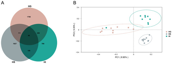 The ASV distribution and the β-diversity characteristics of the mucosal microbiota of rice flower carp. (A) Venn diagram (ASV level); (B) PCoA plot. HG: Gill; HS: Skin; HI: Intestine.