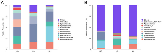 Top 10 phyla and genera by relative abundance of the mucosal microbiota of rice flower carp. (A) Top 10 phyla; (B) Top 10 genera. HG: Gill; HS: Skin; HI: Intestine.
