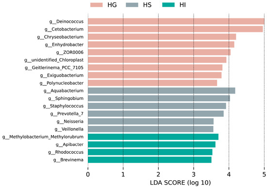 LEfSe analysis identified genera that were significantly enriched in one mucosal site (Figure 4). Results indicated that significantly differentially abundant genera in the HG included Deinococcus, Cetobacterium, Chryseobacterium, Enhydrobacter, ZOR006, unidentified_Chloroplast, Geitlerinema_PCC_7105, Exiguobacterium, and Polynucleobacter; in the HS: Aquabacterium, Sphingobium, Staphylococcus, Prevotella_7, Neisseria, and Veillonella; in the HI: Methylobacterium_Methylorubrum, Apiabacter, Rhodococcus, and Brevinema.