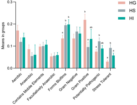 Functional prediction using BugBase showed significant phenotypic differences (Figure 5). Compared with the HG microbiota, Forms Biofilms significantly increased in the HS and HI microbiota (p < 0.05). Compared with the HG microbiota, the HS microbiota exhibited significantly reduced Gram-Positive (p < 0.05), while showing increased Potentially Pathogenic and Stress Tolerant phenotypes (p < 0.05). Furthermore, Stress Tolerant phenotype in the HS microbiota was significantly higher than that in the HI microbiota (p < 0.05).