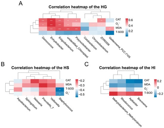 Correlation analysis highlighted site-specific relationships between differentially abundant genera and antioxidant indicators (Figure 6). Among differentially abundant genera in the HG (Figure 6A), the relative abundances of Deinococcus, Enhydrobacter, Exiguobacterium, unidentified_Chloroplast, and Polynucleobacter showed significantly positive correlations with CAT activity, MDA levels, and O2− levels (p < 0.05), the relative abundance of Cetobacterium exhibited a significantly positive correlation with T-SOD activity (p < 0.05), the relative abundance of Chryseobacterium showed a significantly positive correlation with O2− levels (p < 0.05), the relative abundance of ZOR006 demonstrated significantly positive correlations with both CAT activity and O2− levels (p < 0.05), and the relative abundance of Geitlerinema_PCC_7105 showed a significantly positive correlation with MDA levels (p < 0.05). In the HS (Figure 6B), among differentially abundant genera, the relative abundance of Staphylococcus exhibited significantly negative correlations with O2− levels and T-SOD activity (p < 0.05). In the HI (Figure 6C), differentially abundant genera Methylobacterium_Methylorubrum, Apiabacter, Rhodococcus, and Brevinema showed no significant correlations with CAT activity, MDA levels, O2− levels, or T-SOD activity (p > 0.05).