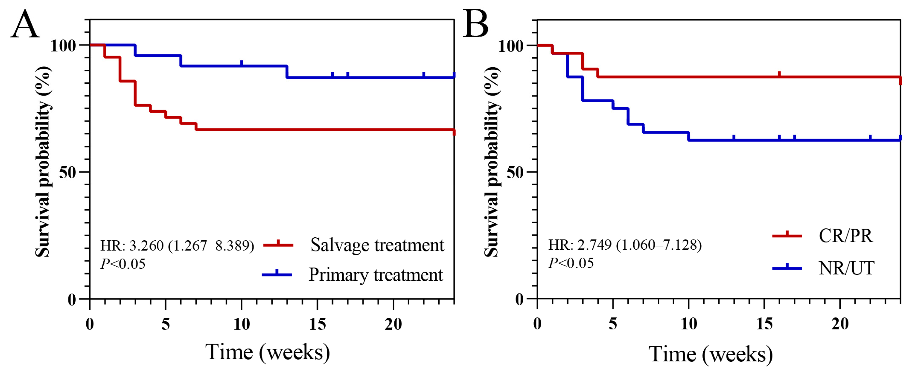 | Salvage treatment | 19/36 (52.8%) | 23/30 (76.7%) | 0.34 (0.12–0.99, p = 0.048) | 0.10 (0.02–0.61, p = 0.013) | 0.10 (0.02–0.56, p = 0.008) | |