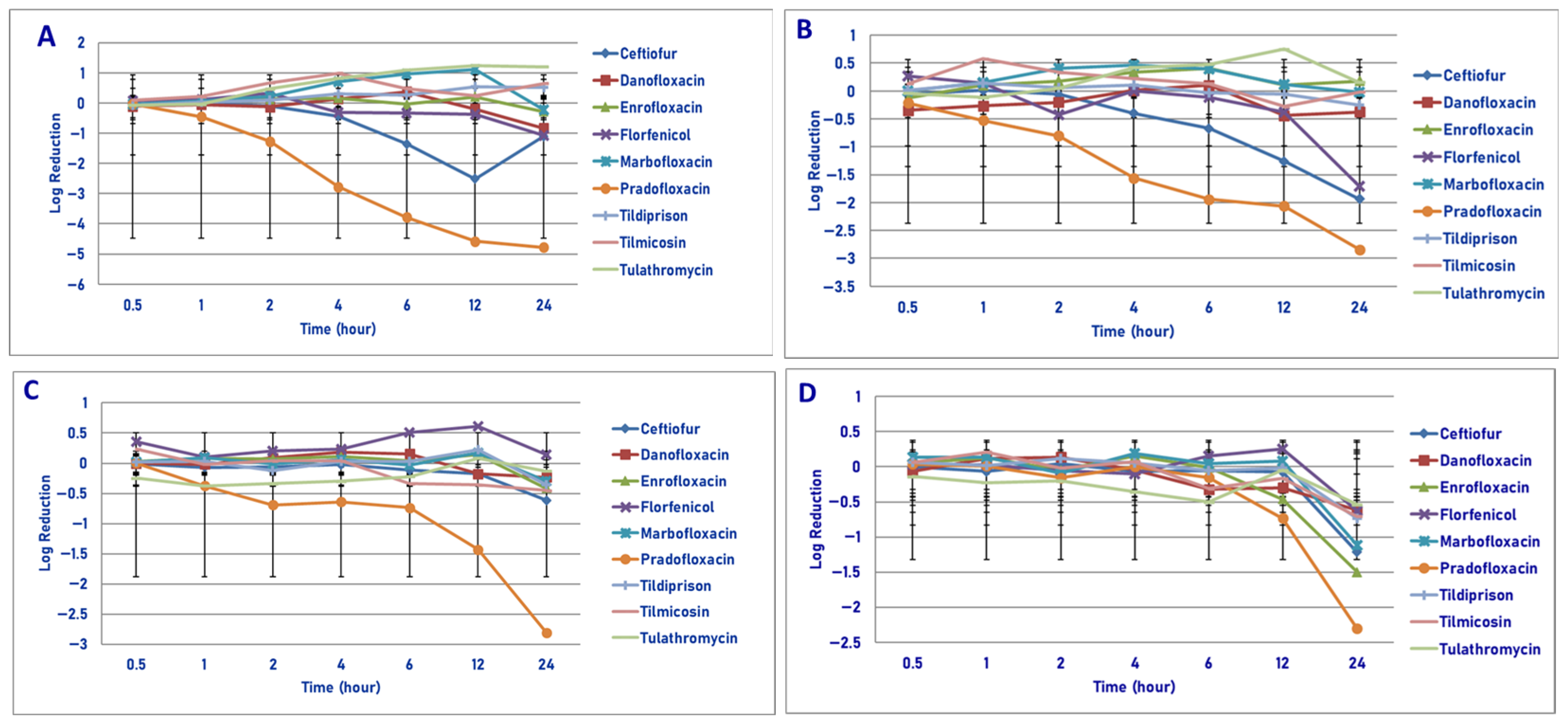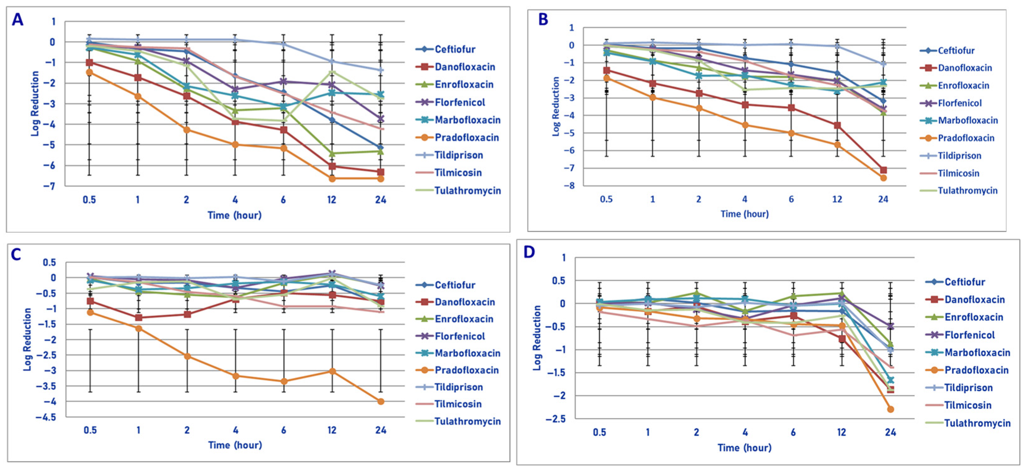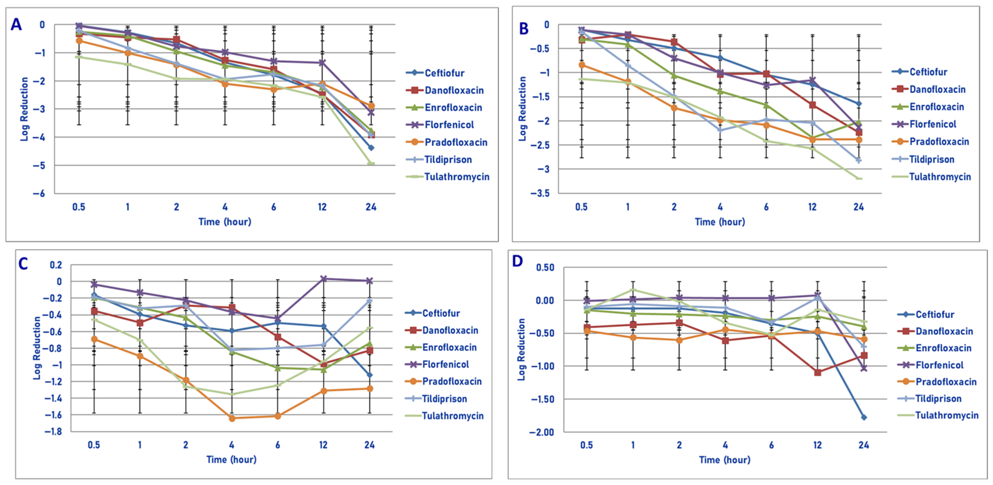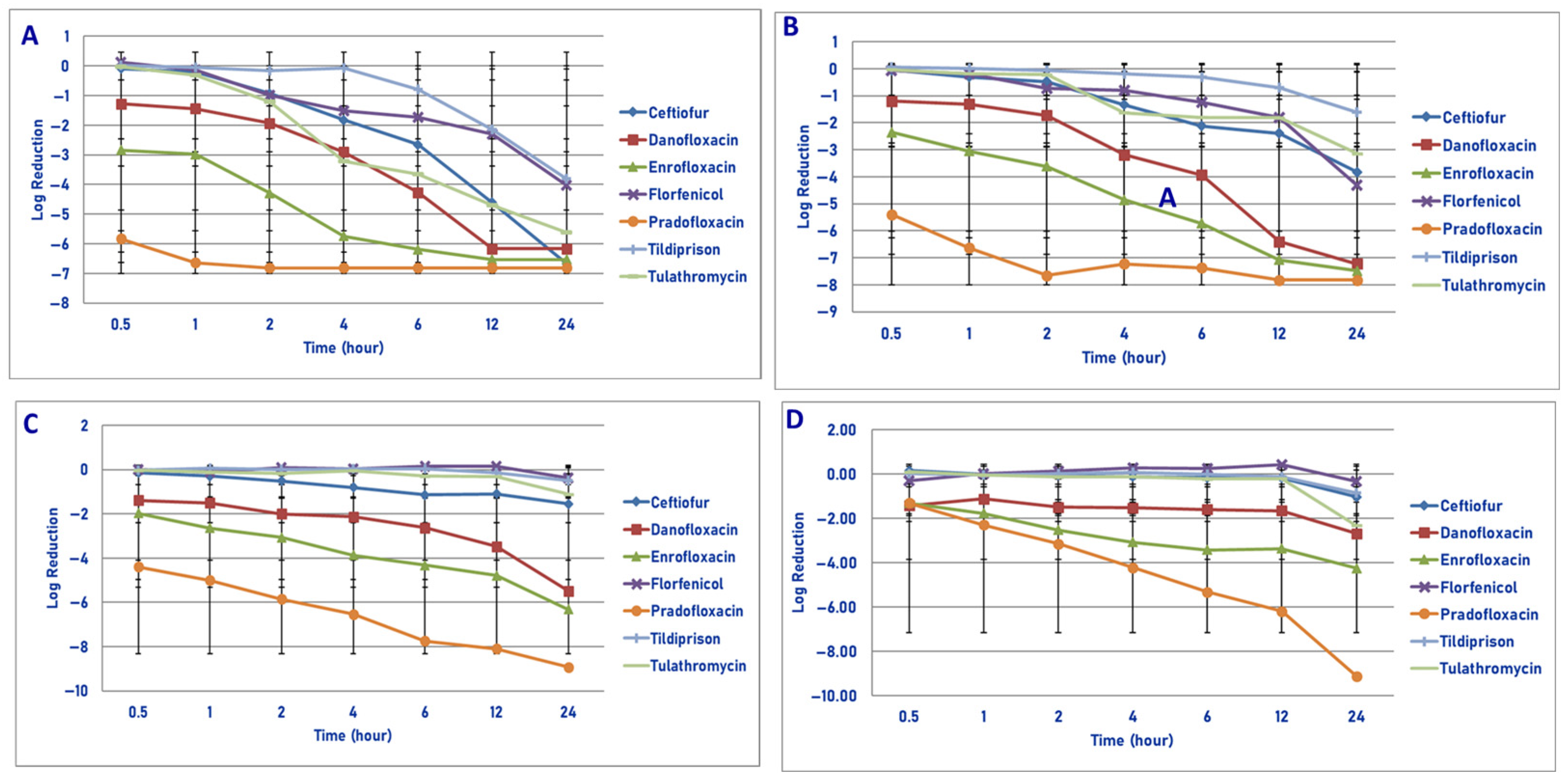 Comparative killing of Mannheimia haemolytica by 7 antimicrobial agents at the Tissuemax: (A) 106 cfu/mL, (B) 107cfu/mL, (C) 108 cfu/mL, (D) 109 cfu/mL drug concentrations. (A) Tissuemax 106 cfu/mL, 0.5 h: enrofloxacin vs. ceftiofur (p = 0.0052), florfenicol (p = 0.0061), tildipirosin (p = 0.0003), tulathromycin (p = 0.0022); pradofloxacin vs. ceftiofur (p < 0.0001), danofloxacin (p = 0.0003), florfenicol (p < 0.0001), tildipirosin (p < 0.0001), tulathromycin (p < 0.0001). One hour: enrofloxacin vs. ceftiofur (p = 0.0054), florfenicol (p = 0.0169), tildipirosin (p < 0.0001), tulathromycin (p = 0.0069); pradofloxacin vs. ceftiofur (p < 0.0001), danofloxacin (p < 0.0001), florfenicol (p < 0.0001), tildipirosin (p < 0.0001), tulathromycin (p < 0.0001). Two hours: enrofloxacin vs. ceftiofur (p < 0.0001), florfenicol (p = 0.0008), tildipirosin (p < 0.0001), tulathromycin (p < 0.0001); pradofloxacin vs. ceftiofur (p < −0.0001), danofloxacin (p < 0.0001), florfenicol (p < 0.0001), tildipirosin (p < 0.0001), tulathromycin (p < 0.0001). Four hours: danofloxacin vs. tildipirosin (p = 0.0006); enrofloxacin vs. ceftiofur (p < 0.0001), florfenicol (p < 0.0001), tildipirosin (p < 0.0001), tulathromycin (p = 0.0154); pradofloxacin vs. ceftiofur (p < 0.0001), danofloxacin (p = 0.0114), florfenicol (p < 0.0001), tildipirosin (p < 0.0001), tulathromycin (p = 0.0003); tulathromycin vs. tildipirosin (p = 0.0021). Six hours: danofloxacin vs. florfenicol (p = 0.0142), tildipirosin (p < 0.0001); enrofloxacin vs. ceftiofur (p < 0.0001), florfenicol (p < 0.0001), tildipirosin (p < 0.0001), tulathromycin (p = 0.0137); pradofloxacin vs. ceftiofur (p < 0.0001), florfenicol (p < 0.0001), tildipirosin (p < 0.0001), tulathromycin (p = 0.0056); tulathromycin vs. tildipirosin (p = 0.0022). Twelve hours: ceftiofur vs. tildipirosin (p = 0.0188); danofloxacin vs. florfenicol (p < 0.0001), tildipirosin (p < 0.0001); enrofloxacin vs. florfenicol (p < 0.0001), tildipirosin (p < 0.0001); pradofloxacin vs. florfenicol (p < 0.0001), tildipirosin (p < 0.0001); tulathromycin vs. tildipirosin (p = 0.0162). Twenty-four hours: ceftiofur vs. tildipirosin (p = 0.0016); danofloxacin vs. tildipirosin (p = 0.0026); enrofloxacin vs. tildipirosin (p = 0.0015); pradofloxacin vs. tildipirosin (p = 0.0048). (B) Tissuemax 107 cfu/mL, 0.5 h: pradofloxacin vs. ceftiofur (p < 0.0001), danofloxacin (p = 0.0309), florfenicol (p < 0.0001), tildipirosin (p < 0.0001), tulathromycin (p < 0.0001). One hour: enrofloxacin vs. tildipirosin (p = 0.0198); pradofloxacin vs. ceftiofur (p < 0.0001), danofloxacin (p = 0.0002), florfenicol (p < 0.0001), tildipirosin (p < 0.0001), tulathromycin (p < 0.0001). Two hours: enrofloxacin vs. ceftiofur (p = 0.0187), tildipirosin (p = 0.0017), tulathromycin (p = 0.0047); pradofloxacin vs. ceftiofur (p < 0.0001), danofloxacin (p < 0.0001), florfenicol (p < 0.0001), tildipirosin (p < 0.0001), tulathromycin (p < 0.0001). Four hours: enrofloxacin vs. ceftiofur (p = 0.0029), florfenicol (p = 0.0004), tildipirosin (p < 0.0001), tulathromycin (p = 0.0109); pradofloxacin vs. ceftiofur (p < 0.0001), danofloxacin (p = 0.0030), florfenicol (0 < 0.0001), tildipirosin (p < 0.0001), tulathromycin (p < 0.0001). Six hours: danofloxacin vs. tildipirosin (p = 0.0097); enrofloxacin vs. ceftiofur (p < 0.0001), florfenicol (p < 0.0001), tildipirosin (p < 0.0001), tulathromycin (p = 0.0003); pradofloxacin vs. ceftiofur (p < 0.0001), florfenicol (p < 0.0001), tildipirosin (p < 0.0001), tulathromycin (p < 0.0001). Twelve hours: danofloxacin vs. ceftiofur (p = 0.0010), florfenicol (p < 0.0001), tildipirosin (p < 0.0001), tulathromycin (p < 0.0001); enrofloxacin vs. ceftiofur (p < 0.0001), florfenicol (p < 0.0001), tildipirosin (p < 0.0001), tulathromycin (p < 0.0001); pradofloxacin vs. ceftiofur (p < 0.0001), florfenicol (p < 0.0001), tildipirosin (p < 0.0001), tulathromycin (p < 0.0001). Twenty-four hours: danofloxacin vs. ceftiofur (p = 0.0175), tildipirosin (p < 0.0001), tulathromycin (p = 0.0007); enrofloxacin vs. ceftiofur (p = 0.0014), florfenicol (p = 0.0367), tildipirosin (p < 0.0001), tulathromycin (p < 0.0001); pradofloxacin vs. ceftiofur (p = 0.0016), tildipirosin (p < 0.0001), tulathromycin (p < 0.0001). (C) Tissuemax 108 cfu/mL, 0.5 h: pradofloxacin vs. ceftiofur (p < 0.0001), florfenicol (p < 0.0001), tildipirosin (p < 0.0001), tulathromycin (p < 0.0001). One hour: danofloxacin vs. ceftiofur (p = 0.0034), florfenicol (p = 0.0026), tildipirosin (p = 0.0004), tulathromycin (p = 0.0016); enrofloxacin vs. ceftiofur (p = 0.0176), florfenicol (p = 0.0132), tildipirosin (p = 0.0010), tulathromycin (p = 0.0068); pradofloxacin vs. ceftiofur (p < 0.0001), florfenicol (p < 0.0001), tildipirosin (p < 0.0001), tulathromycin (p < 0.0001). Two hours: enrofloxacin vs. ceftiofur (p = 0.0075), florfenicol (p = 0.0003), tildipirosin (p = 0.0002), tulathromycin (p = 0.0008); pradofloxacin vs. ceftiofur (p < 0.0001), florfenicol (p < 0.0001), tildipirosin (p < 0.0001), tulathromycin (p < 0.0001). Four hours: enrofloxacin vs. ceftiofur (p = 0.0001), florfenicol (p < 0.0001), tildipirosin (p < 0.0001), tulathromycin (p < 0.0001); pradofloxacin vs. ceftiofur (p < 0.0001), danofloxacin (p = 0.0137), florfenicol (p < 0.0001), tildipirosin (p < 0.0001), tulathromycin (p < 0.0001). Six hours: enrofloxacin vs. ceftiofur (p < 0.0001), danofloxacin (p = 0.0002), florfenicol (p < 0.0001), tildipirosin (p < 0.0001), tulathromycin (p < 0.0001); pradofloxacin vs. ceftiofur (p < 0.0001), florfenicol (p < 0.0001), tildipirosin (p < 0.0001), tulathromycin (p < 0.0001). Twelve hours: enrofloxacin vs. ceftiofur (p < 0.0001), florfenicol (p < 0.0001), tildipirosin (p < 0.0001), tulathromycin (p < 0.0001); pradofloxacin vs. ceftiofur (p < 0.0001), danofloxacin (p = 0.0021), tulathromycin (p < 0.0001). Twenty-four hours: danofloxacin vs. florfenicol (p = 0.0037), tildipirosin (p = 0.0054), tulathromycin (p = 0.0235); enrofloxacin vs. ceftiofur (p < 0.0001), florfenicol (p <