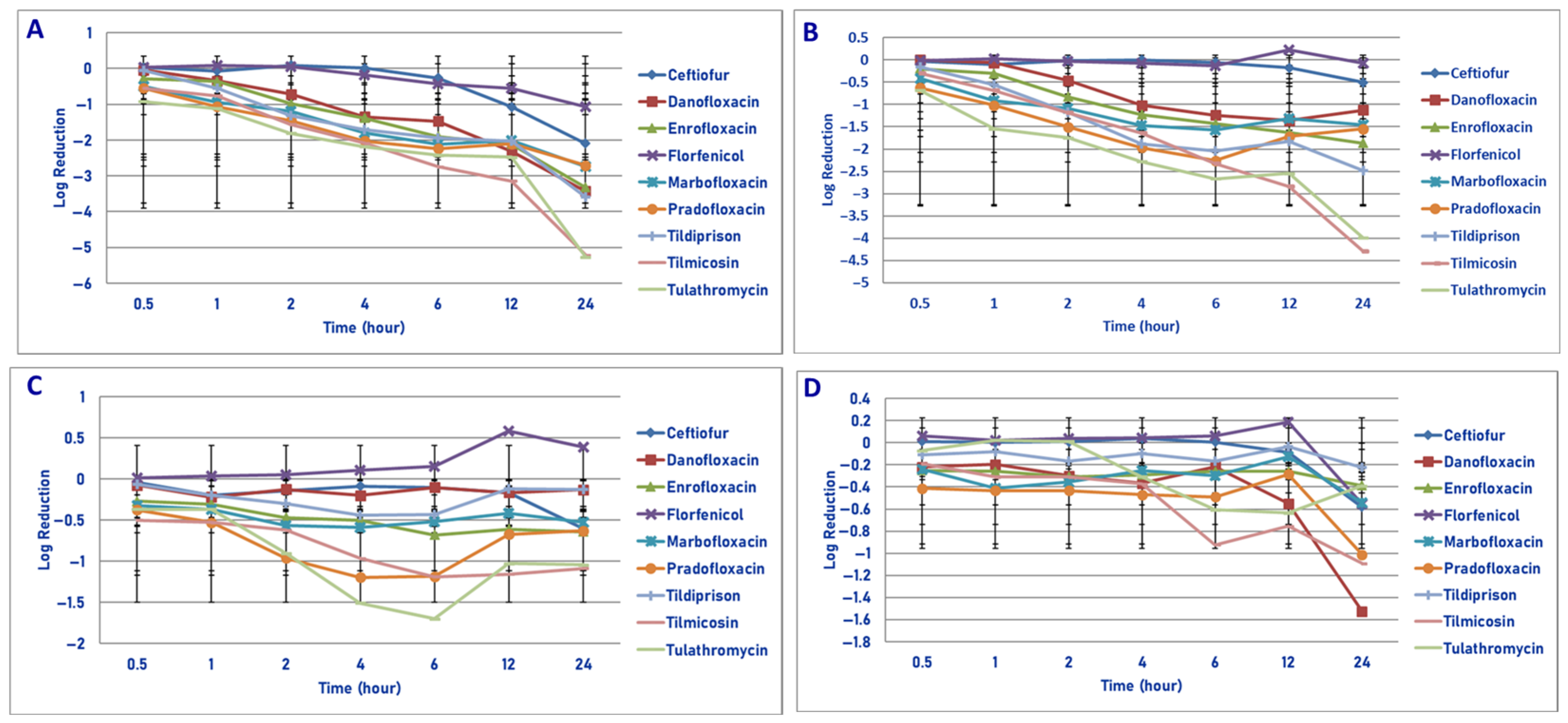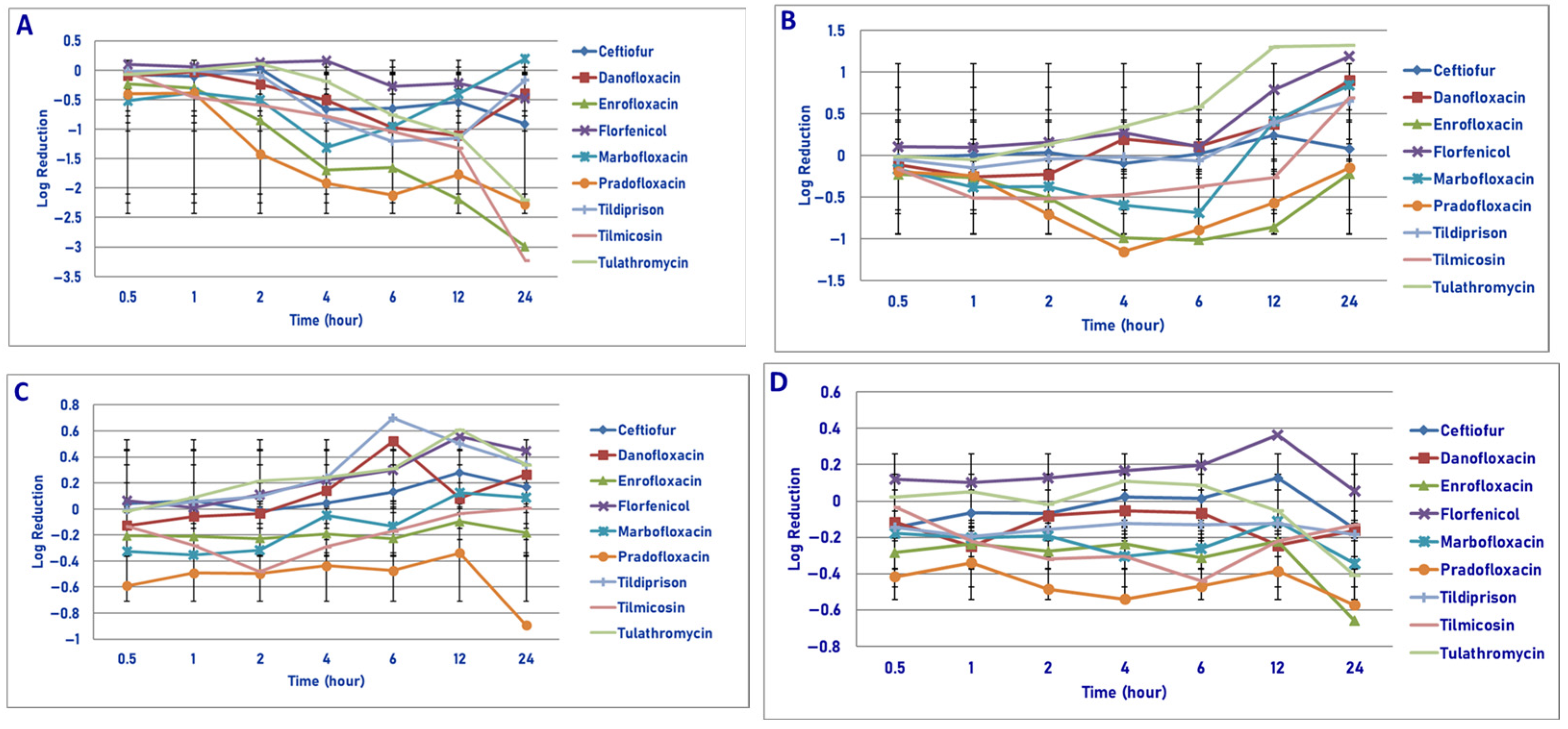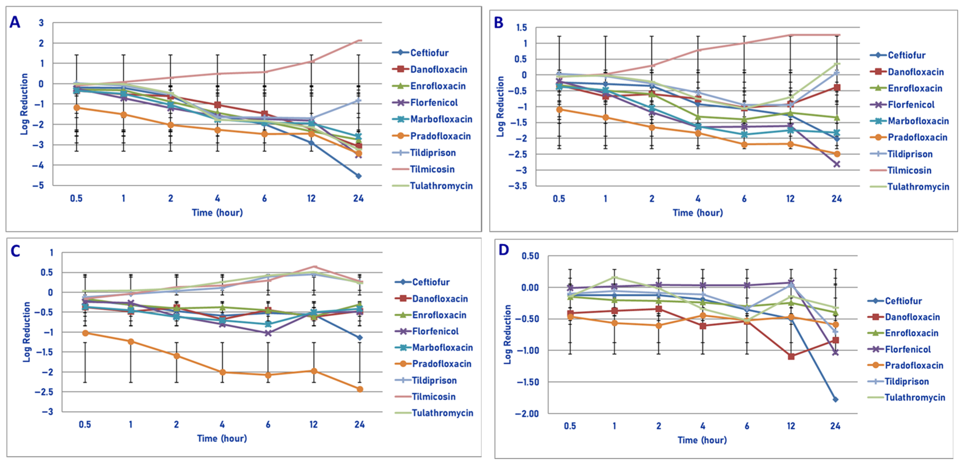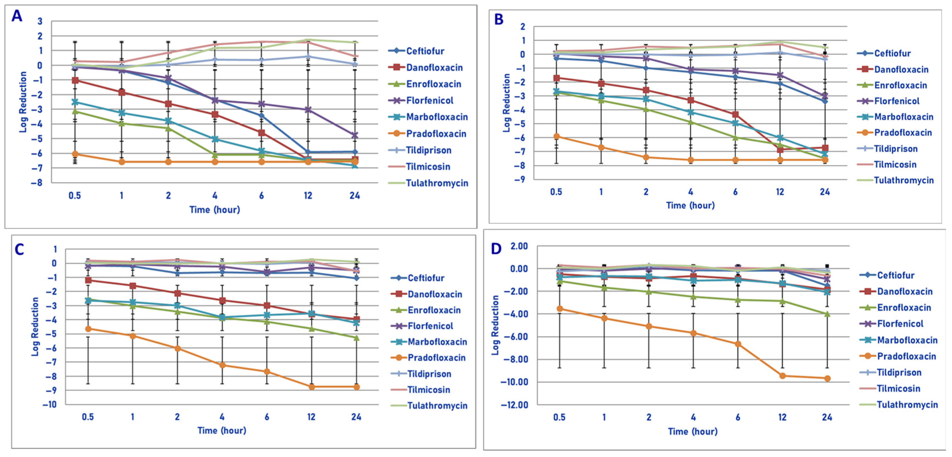 Comparative killing of Mannheimia haemolytica by 7 antimicrobial agents at the Tissuemax: (A) 106 cfu/mL, (B) 107cfu/mL, (C) 108 cfu/mL, (D) 109 cfu/mL drug concentrations. (A) Tissuemax 106 cfu/mL, 0.5 h: enrofloxacin vs. ceftiofur (p = 0.0052), florfenicol (p = 0.0061), tildipirosin (p = 0.0003), tulathromycin (p = 0.0022); pradofloxacin vs. ceftiofur (p < 0.0001), danofloxacin (p = 0.0003), florfenicol (p < 0.0001), tildipirosin (p < 0.0001), tulathromycin (p < 0.0001). One hour: enrofloxacin vs. ceftiofur (p = 0.0054), florfenicol (p = 0.0169), tildipirosin (p < 0.0001), tulathromycin (p = 0.0069); pradofloxacin vs. ceftiofur (p < 0.0001), danofloxacin (p < 0.0001), florfenicol (p < 0.0001), tildipirosin (p < 0.0001), tulathromycin (p < 0.0001). Two hours: enrofloxacin vs. ceftiofur (p < 0.0001), florfenicol (p = 0.0008), tildipirosin (p < 0.0001), tulathromycin (p < 0.0001); pradofloxacin vs. ceftiofur (p < −0.0001), danofloxacin (p < 0.0001), florfenicol (p < 0.0001), tildipirosin (p < 0.0001), tulathromycin (p < 0.0001). Four hours: danofloxacin vs. tildipirosin (p = 0.0006); enrofloxacin vs. ceftiofur (p < 0.0001), florfenicol (p < 0.0001), tildipirosin (p < 0.0001), tulathromycin (p = 0.0154); pradofloxacin vs. ceftiofur (p < 0.0001), danofloxacin (p = 0.0114), florfenicol (p < 0.0001), tildipirosin (p < 0.0001), tulathromycin (p = 0.0003); tulathromycin vs. tildipirosin (p = 0.0021). Six hours: danofloxacin vs. florfenicol (p = 0.0142), tildipirosin (p < 0.0001); enrofloxacin vs. ceftiofur (p < 0.0001), florfenicol (p < 0.0001), tildipirosin (p < 0.0001), tulathromycin (p = 0.0137); pradofloxacin vs. ceftiofur (p < 0.0001), florfenicol (p < 0.0001), tildipirosin (p < 0.0001), tulathromycin (p = 0.0056); tulathromycin vs. tildipirosin (p = 0.0022). Twelve hours: ceftiofur vs. tildipirosin (p = 0.0188); danofloxacin vs. florfenicol (p < 0.0001), tildipirosin (p < 0.0001); enrofloxacin vs. florfenicol (p < 0.0001), tildipirosin (p < 0.0001); pradofloxacin vs. florfenicol (p < 0.0001), tildipirosin (p < 0.0001); tulathromycin vs. tildipirosin (p = 0.0162). Twenty-four hours: ceftiofur vs. tildipirosin (p = 0.0016); danofloxacin vs. tildipirosin (p = 0.0026); enrofloxacin vs. tildipirosin (p = 0.0015); pradofloxacin vs. tildipirosin (p = 0.0048). (B) Tissuemax 107 cfu/mL, 0.5 h: pradofloxacin vs. ceftiofur (p < 0.0001), danofloxacin (p = 0.0309), florfenicol (p < 0.0001), tildipirosin (p < 0.0001), tulathromycin (p < 0.0001). One hour: enrofloxacin vs. tildipirosin (p = 0.0198); pradofloxacin vs. ceftiofur (p < 0.0001), danofloxacin (p = 0.0002), florfenicol (p < 0.0001), tildipirosin (p < 0.0001), tulathromycin (p < 0.0001). Two hours: enrofloxacin vs. ceftiofur (p = 0.0187), tildipirosin (p = 0.0017), tulathromycin (p = 0.0047); pradofloxacin vs. ceftiofur (p < 0.0001), danofloxacin (p < 0.0001), florfenicol (p < 0.0001), tildipirosin (p < 0.0001), tulathromycin (p < 0.0001). Four hours: enrofloxacin vs. ceftiofur (p = 0.0029), florfenicol (p = 0.0004), tildipirosin (p < 0.0001), tulathromycin (p = 0.0109); pradofloxacin vs. ceftiofur (p < 0.0001), danofloxacin (p = 0.0030), florfenicol (0 < 0.0001), tildipirosin (p < 0.0001), tulathromycin (p < 0.0001). Six hours: danofloxacin vs. tildipirosin (p = 0.0097); enrofloxacin vs. ceftiofur (p < 0.0001), florfenicol (p < 0.0001), tildipirosin (p < 0.0001), tulathromycin (p = 0.0003); pradofloxacin vs. ceftiofur (p < 0.0001), florfenicol (p < 0.0001), tildipirosin (p < 0.0001), tulathromycin (p < 0.0001). Twelve hours: danofloxacin vs. ceftiofur (p = 0.0010), florfenicol (p < 0.0001), tildipirosin (p < 0.0001), tulathromycin (p < 0.0001); enrofloxacin vs. ceftiofur (p < 0.0001), florfenicol (p < 0.0001), tildipirosin (p < 0.0001), tulathromycin (p < 0.0001); pradofloxacin vs. ceftiofur (p < 0.0001), florfenicol (p < 0.0001), tildipirosin (p < 0.0001), tulathromycin (p < 0.0001). Twenty-four hours: danofloxacin vs. ceftiofur (p = 0.0175), tildipirosin (p < 0.0001), tulathromycin (p = 0.0007); enrofloxacin vs. ceftiofur (p = 0.0014), florfenicol (p = 0.0367), tildipirosin (p < 0.0001), tulathromycin (p < 0.0001); pradofloxacin vs. ceftiofur (p = 0.0016), tildipirosin (p < 0.0001), tulathromycin (p < 0.0001). (C) Tissuemax 108 cfu/mL, 0.5 h: pradofloxacin vs. ceftiofur (p < 0.0001), florfenicol (p < 0.0001), tildipirosin (p < 0.0001), tulathromycin (p < 0.0001). One hour: danofloxacin vs. ceftiofur (p = 0.0034), florfenicol (p = 0.0026), tildipirosin (p = 0.0004), tulathromycin (p = 0.0016); enrofloxacin vs. ceftiofur (p = 0.0176), florfenicol (p = 0.0132), tildipirosin (p = 0.0010), tulathromycin (p = 0.0068); pradofloxacin vs. ceftiofur (p < 0.0001), florfenicol (p < 0.0001), tildipirosin (p < 0.0001), tulathromycin (p < 0.0001). Two hours: enrofloxacin vs. ceftiofur (p = 0.0075), florfenicol (p = 0.0003), tildipirosin (p = 0.0002), tulathromycin (p = 0.0008); pradofloxacin vs. ceftiofur (p < 0.0001), florfenicol (p < 0.0001), tildipirosin (p < 0.0001), tulathromycin (p < 0.0001). Four hours: enrofloxacin vs. ceftiofur (p = 0.0001), florfenicol (p < 0.0001), tildipirosin (p < 0.0001), tulathromycin (p < 0.0001); pradofloxacin vs. ceftiofur (p < 0.0001), danofloxacin (p = 0.0137), florfenicol (p < 0.0001), tildipirosin (p < 0.0001), tulathromycin (p < 0.0001). Six hours: enrofloxacin vs. ceftiofur (p < 0.0001), danofloxacin (p = 0.0002), florfenicol (p < 0.0001), tildipirosin (p < 0.0001), tulathromycin (p < 0.0001); pradofloxacin vs. ceftiofur (p < 0.0001), florfenicol (p < 0.0001), tildipirosin (p < 0.0001), tulathromycin (p < 0.0001). Twelve hours: enrofloxacin vs. ceftiofur (p < 0.0001), florfenicol (p < 0.0001), tildipirosin (p < 0.0001), tulathromycin (p < 0.0001); pradofloxacin vs. ceftiofur (p < 0.0001), danofloxacin (p = 0.0021), tulathromycin (p < 0.0001). Twenty-four hours: danofloxacin vs. florfenicol (p = 0.0037), tildipirosin (p = 0.0054), tulathromycin (p = 0.0235); enrofloxacin vs. ceftiofur (p < 0.0001), florfenicol (p <