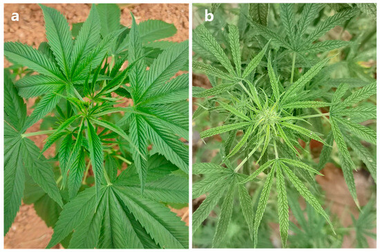 Virus-like symptoms on leaves of industrial hemp. (a) Asymptomatic leaves, (b) Symptomatic leaves exhibiting chlorosis and vein clearing.