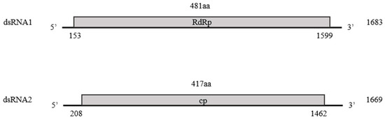 Structurally, the genome of the identified partitivirus was similar to that of other Partitiviridae family members, with two dsRNA segments, dsRNA1 and dsRNA2. DsRNA1was 1683 nt, included a 153 bp 5′-UTR and an 84 bp 3′-UTR, and contained an ORF encoding a 481 aa RdRp with a molecular mass of 55.2 kDa. DsRNA2 was 1669 nt and comprised a 208 bp 5′-UTR and a 207 bp 3′-UTR, and harbored an ORF encoding a 417 aa CP with a molecular mass of 48.4 kDa (Figure 2). This genomic structure is consistent with that observed in the family Partitiviridae.
