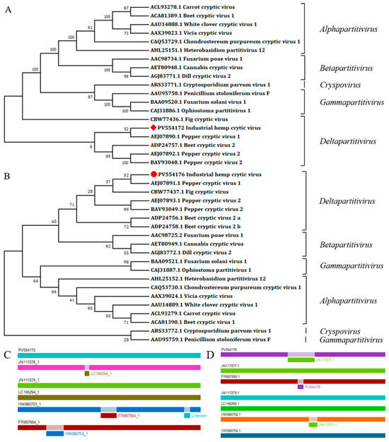 Molecular phylogenetic analyses of partitiviruses and recombination analyses of deltapartitiviruses. (A) Partitiviruses phylogenetic tree based on RdRp aa sequences; (B) partitiviruses phylogenetic tree based on CP aa sequences. The ML trees were conducted in MEGA 7.0 with 1000 bootstrap replicates, and the red square and the red dot are our sequences. (C) DsRNA1 recombinant clades suggested by the RDP4, (D) dsRNA2 recombinant clades suggested by the RDP4.