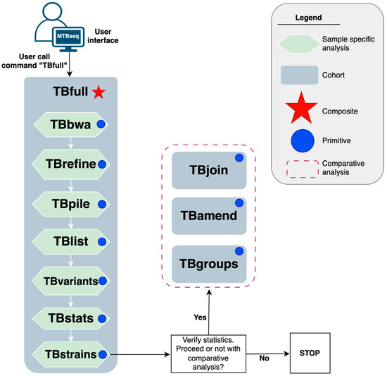 Its execution model is built upon core abstractions (called steps) such as reference mapping (TBbwa) and variant calling (TBvariants). These steps can be broadly classified into two groups based on whether they process a single sample at a time (e.g., TBbwa, TBvariants) or the entire batch (e.g., TBamend, TBgroups). The former are amenable to parallelisation whereas the latter are not. In addition, MTBseq-standard also combines several primitive steps into a composite step (TBfull) which may be called as a single entity to facilitate routine usage as summarized in Figure 1.