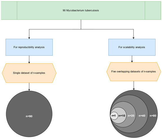 For the scalability study, we partitioned the dataset into six cohorts with an incremental number of samples, namely 5, 10, 20, 40, 80, and lastly 90 FASTQ paired-end files, as illustrated in Figure 3. Additionally, the largest dataset was used to validate the primary outputs produced by the MTBseq and MTBseq-nf (default and parallel) pipelines.