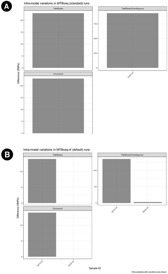 Intra-modal variations across triplicated runs for (A) MTBseq-standard, observed only for three samples (B) MTBseq-nf (default) across triplicated runs, observed only for two samples. No differences were observed across different runs of the MTBseq-nf parallel mode.