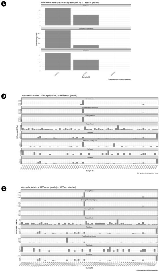 Inter-modal variations between (A) MTBseq-standard and MTBseq-nf (default), wherein only 3 samples have variations. (B) MTBseq-nf (default) and MTBseq-nf (parallel). (C) MTBseq-nf (parallel) and MTBseq-standard.