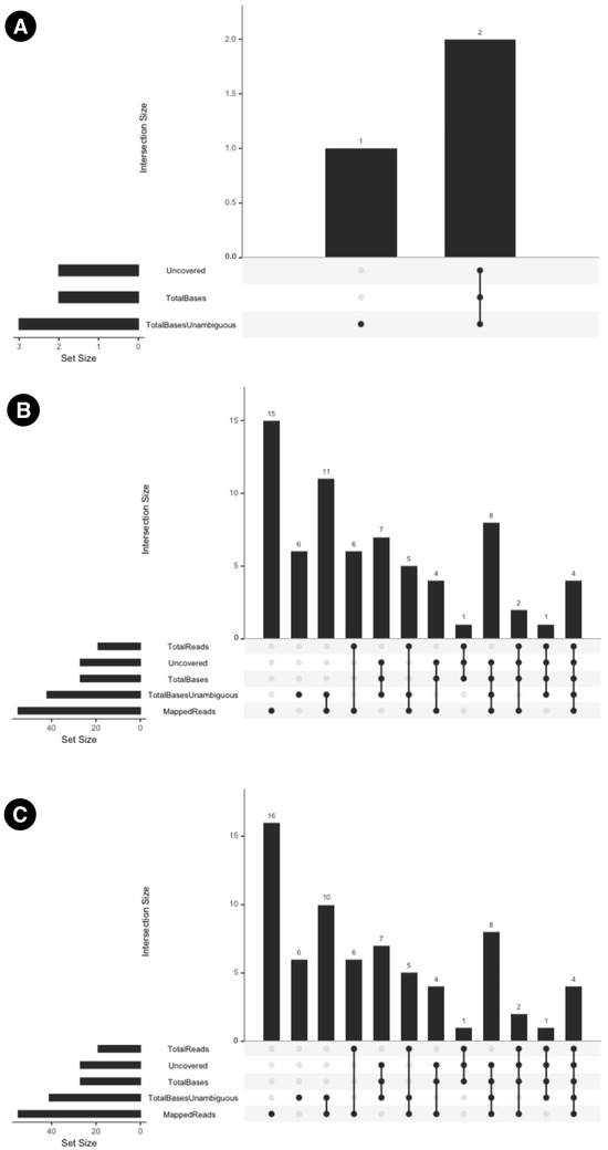 UpSet plots which summarize the inter-modal variations between (A) MTBseq-standard and MTBseq-nf (default). (B) MTBseq-nf (default) and MTBseq-nf (parallel). (C) MTBseq-nf (parallel) and MTBseq-standard.