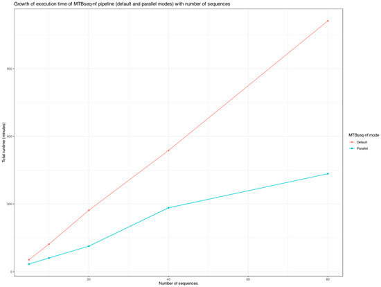 As highlighted in Figure 7, when processing more than 10 FASTQ paired-end files, the execution time of MTBseq-nf (default) is at least double that of MTBseq-nf (parallel), highlighting the significant performance benefits of the parallel mode optimizations. This difference becomes increasingly pronounced as the sample size increases (>20 samples), making MTBseq-nf (parallel) particularly valuable for large-scale genomic analyses requiring substantially less time (<50%).