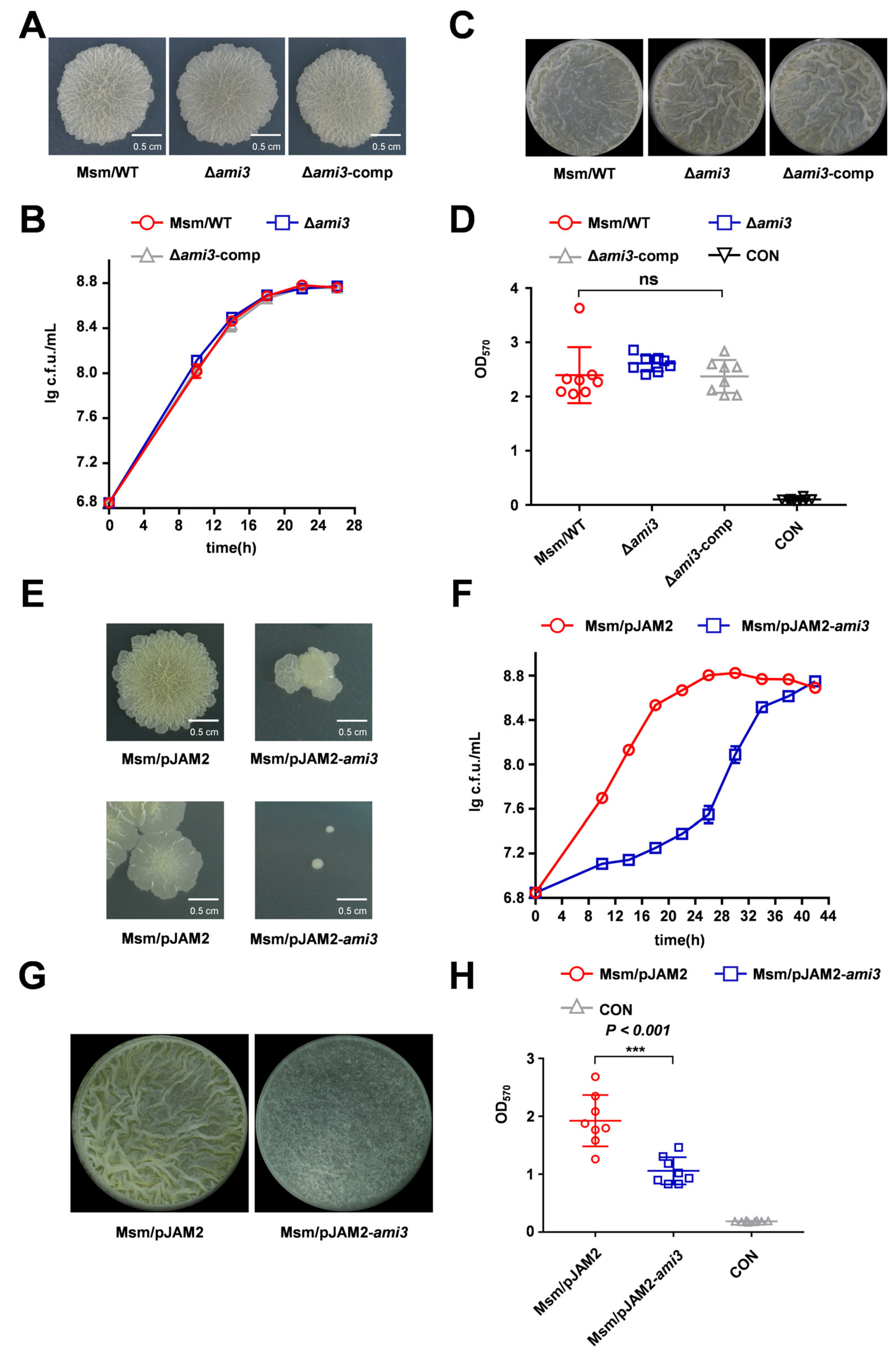 Figure 2. Overexpression of Ami3 recapitulates the ΔhtrA phenotype. (A) Colony morphology of wild-type (WT), Δami3, and Δami3-comp strains assessed by spot assay. (B) Growth curves of WT, Δami3, and Δami3-comp strains under standard culture conditions. Data represent mean ± SD of at least three biological replicates. (C) Representative images of air-liquid interface biofilms formed by WT, Δami3, and Δami3-comp strains. (D) Quantification of biofilm biomass for WT, Δami3, and Δami3-comp by crystal violet staining. Data represent mean ± SD of at least eight biological replicates. (E) Comparison of differences in colony morphology between Msm/pJAM2-ami3 and WT on spot plates (top panel), and Msm/pJAM2-ami3 and WT on dilution plate (bottom panel). (F) Growth curves of WT and the ami3 overexpression strain under normal conditions. (G) Representative images of air-liquid interface biofilms formed by Msm/pJAM2-ami3 and WT. (H) Quantification of biofilm biomass for Msm/pJAM2-ami3 and WT strain by crystal violet staining. Data represent mean ± SD of at least eight biological replicates. Statistically significant differences are represented as *** (p < 0.001, ns, not significant).