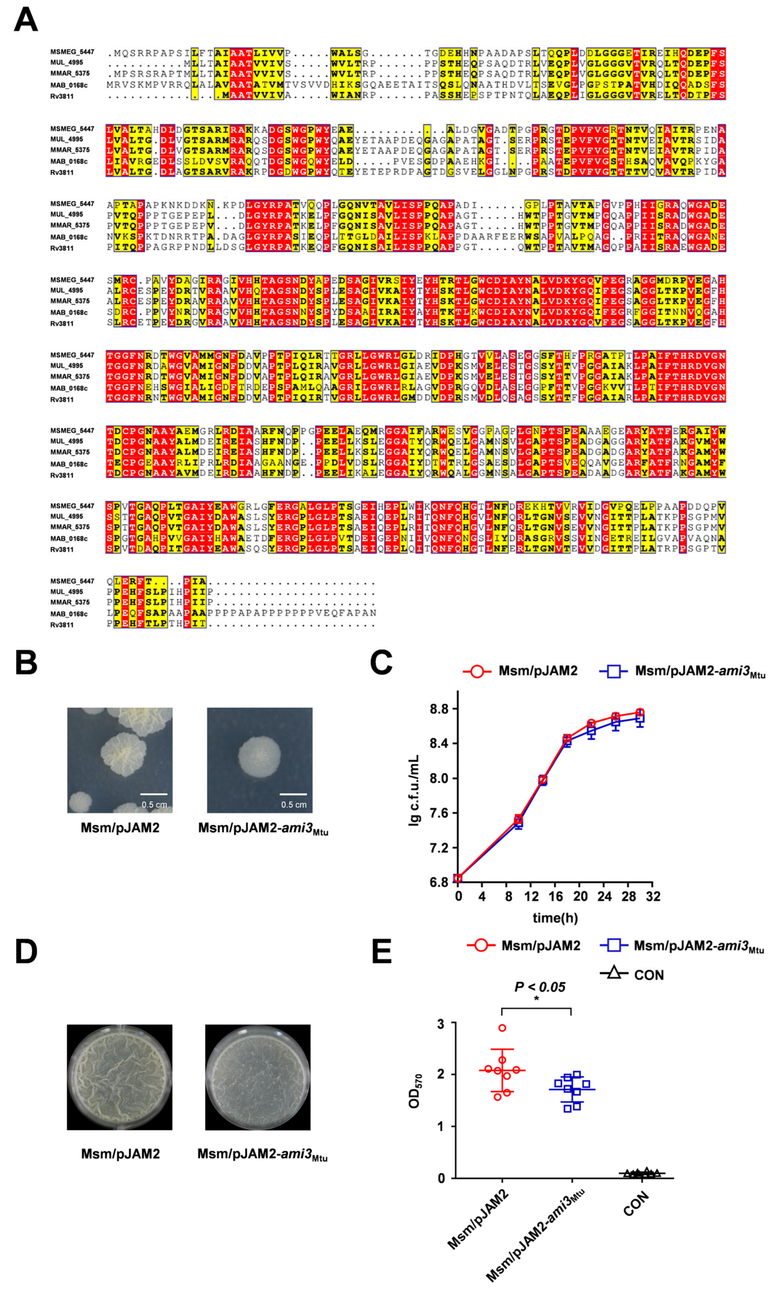 Figure 3. Heterologous expression of M. tuberculosis Ami3 inhibits biofilm formation in M. smegmatis. (A) Sequence alignment of Ami3 from M. smegmatis (Msmeg_5447), M. tuberculosis (Rv3811), M. marinum (MMAR_5375), M. ulcerans (MUL_4995) and M. abscessus (MAB_0168c). Red indicates strictly conserved residues across all five mycobacterial species, yellow indicates semi-conserved substitutions (within the same amino acid class), and white indicates non-conserved residues. (B) Colony morphology of Msm/pJAM2-ami3Mtu and WT, shown using a streaking assay. (C) Growth curves of Msm/pJAM2-ami3Mtu and WT strains under standard culture conditions. Data represent mean ± SD of at least three biological replicates. (D) Representative images of air-liquid interface biofilms formed by Msm/pJAM2-ami3Mtu and WT strains. (E) Quantification of biofilm biomass of Msm/pJAM2-ami3Mtu and WT by crystal violet staining. Data represent mean ± SD of at least three biological replicates in growth curves and at least eight biological replicates in crystal violet staining quantitative assay. Statistically significant differences are represented as * (p < 0.05).