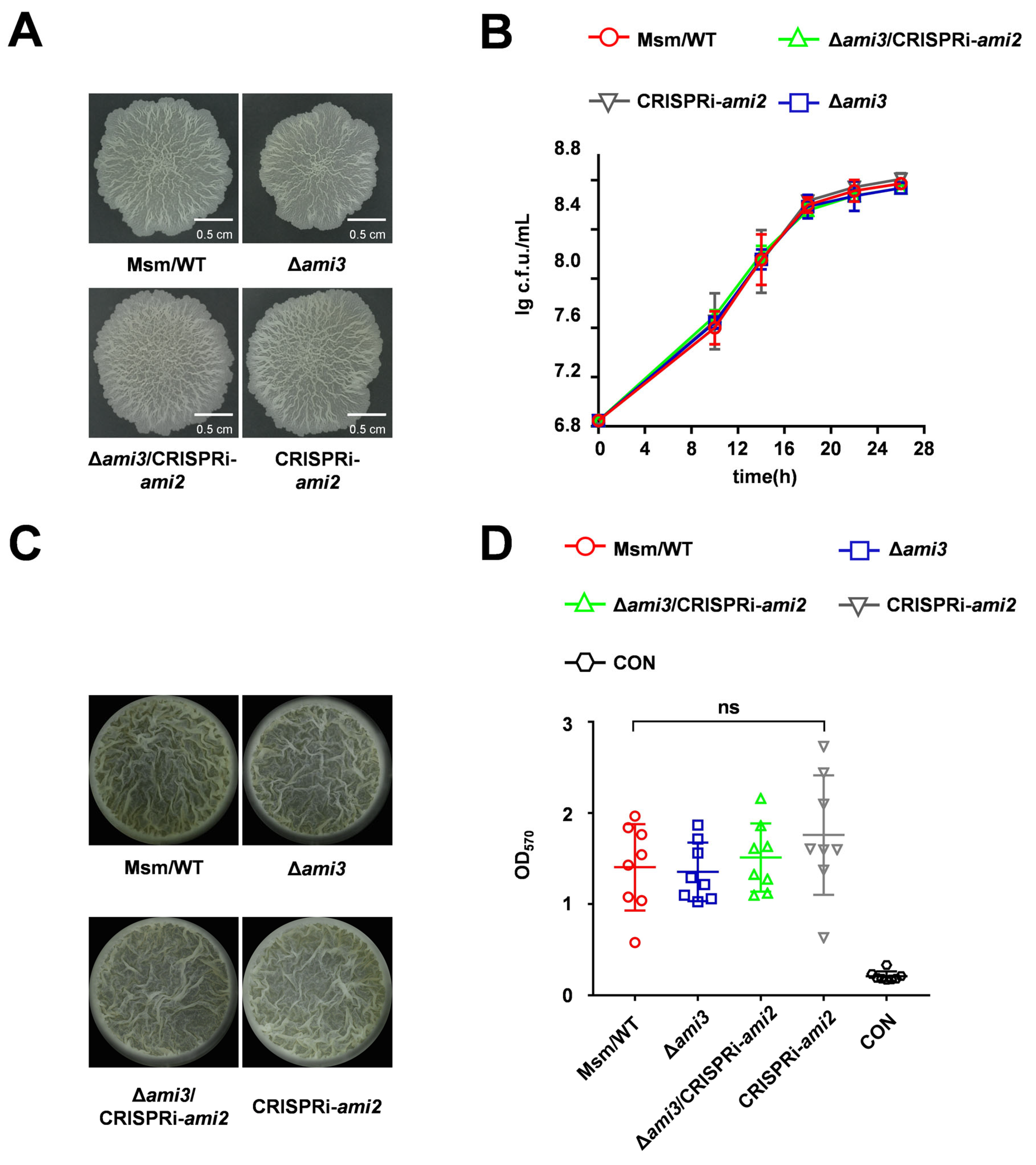 These findings demonstrate that the core function of Ami3 as a negative regulator of biofilm formation is conserved in M. tuberculosis, while its pronounced effect on growth appears to be species-specific.