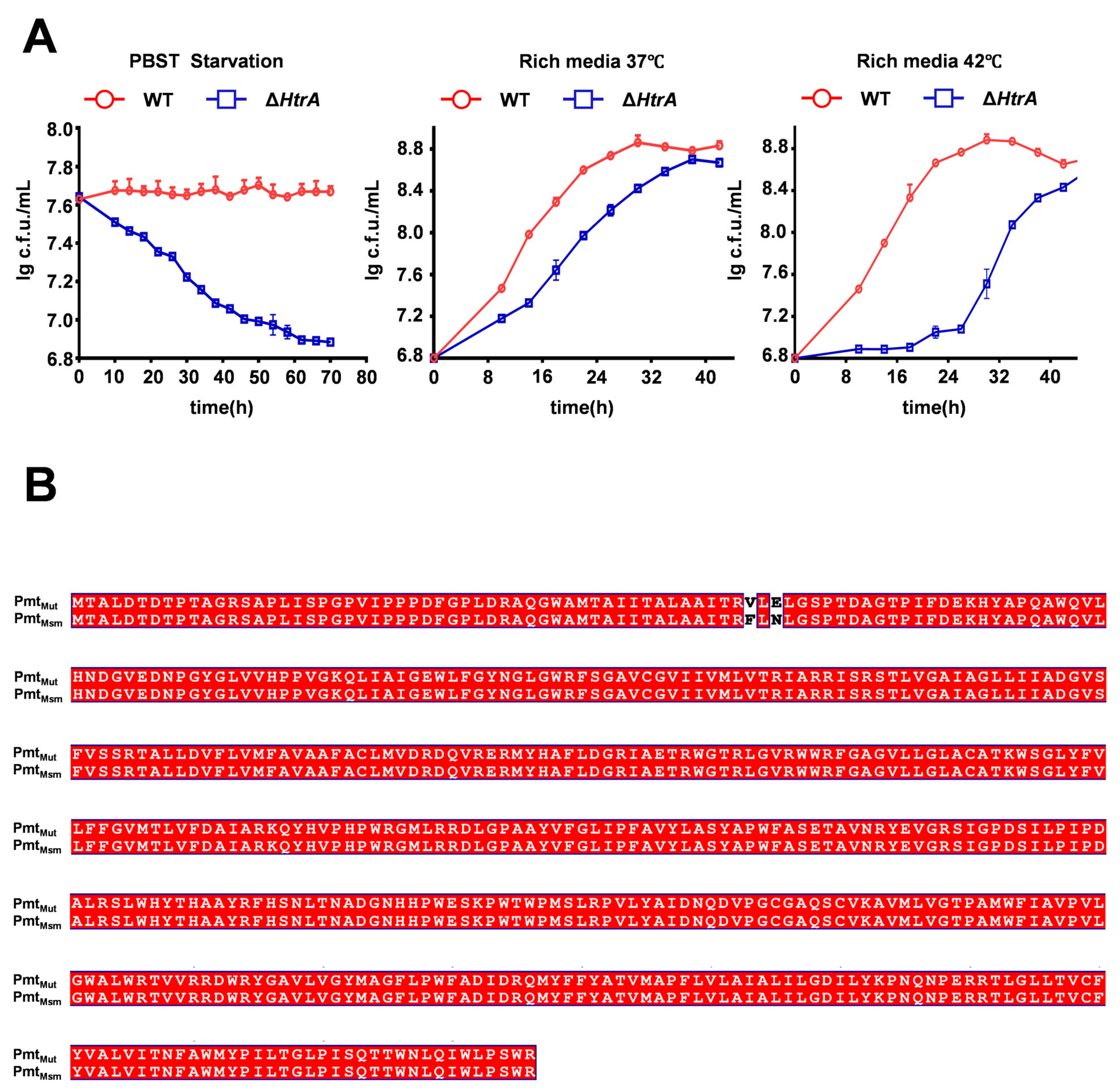 Figure 5. The ΔhtrA strain exhibits growth defects and harbors novel compensatory mutations in pmt. (A) Growth curves of wild-type (WT) and ΔhtrA strains under three conditions: rich media at 37 °C, high temperature (42 °C), carbon-nitrogen starvation (PBS-Tween 20). ΔhtrA strain shows impaired growth under all conditions. Error bars represent SD of the mean. (B) Sequence alignment of Pmt from the wild-type (PmtMsm) and the ΔhtrA mutant (Pmtmut). The alignment confirms the acquisition of two novel mutations, F53V and N55E, in the ΔhtrA background. Red denotes amino acid residues that are identical in the mutant and wild-type sequences. Conversely, white highlights the amino acid substitutions specific to the mutant.