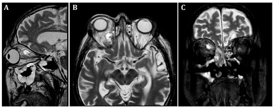 Initial pre-operative magnetic resonance imaging. T2-weighted MRI scans of the orbits. (A)—sagittal, (B)—frontal, (C)—transverse planes. Visible infiltration of extraocular muscles and optic nerve. Inflammatory opacifications in ethmoid cells and maxillary sinus, extending into the orbital adipose tissue and extraocular muscles, causing osseous destruction of ethmoid cells.