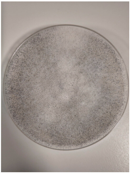 Histopathological examination of the specimens from ethmoid and maxillary sinuses confirmed fungal infiltration, described as “mixed-cell infiltration with fragments of hyphae (most likely belonging to the genus Mucor)”. Direct KOH microscopy was performed and revealed fungal hyphae. Tissue fragments collected during the first surgery were inoculated on Sabouraud glucose agar with gentamicin and chloramphenicol (bioMerieux, Marcy-l’Etoile, France) and on Sabouraud dextrose broth (Biomaxima, Lublin, Poland). Cultures were incubated at 25 °C and 35 °C. The significant growth of Rhizopus arrhizus was obtained from all samples. Colonies were very fast growing, white cottony at first, becoming brownish-gray to blackish-gray (Figure 6). Non-septate sporangiophores ending with spore-filled ellipsoidal sporangia as well as non-septate hyphae and rhizoids were observed in slides prepared with Lactophenol blue solution (Sigma-Aldrich, manufactured by Merck, Darmstadt, Germany)—presented in Figure 7. Species’ identification was also confirmed using matrix-associated laser desorption ionization time-of-flight mass spectrometry (MALDI Biotyper® Sirius, Bruker Daltonics, Brema, Germany). The antifungal susceptibility testing was performed using RPMI agar plates (bioMerieux, Marcy-l’Etoile, France) and MIC Test Strips (Liofilchem, Roseto degli Abruzzi, Italy) and the results were the following: amphotericin B MIC = 0.75; itraconazole MIC = 4; posaconazole MIC = 0.75; and isavuconazole MIC = 2. While molecular methods are considered the reference standard for fungal species’ identification, they were not available at our center. The combination of the aforementioned assessments, however, enabled reliable identification of the pathogen.