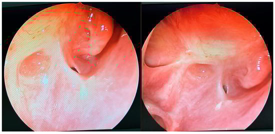 Postoperative endoscopic evaluations demonstrated a normal healing process, with no evidence of pathological secretions and maintained patency of the sinus outflow tracts (Figure 8). However, the mucosal lining of the maxillary and ethmoid sinuses remained thickened, consistent with ongoing post-inflammatory changes.