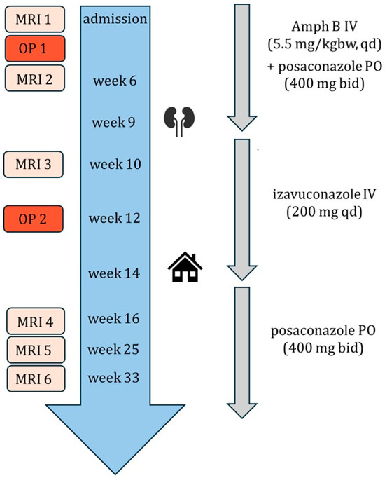 Graphic summary of the patient’s treatment. MRI = magnetic resonance imaging. OP = surgery. Amph B = amphotericin B. PO = oral. IV = intravenous. kgbw = kilogram of body weight. qd = once daily. bid = twice a day. Kidney symbol = renal insufficiency. Home = discharge.