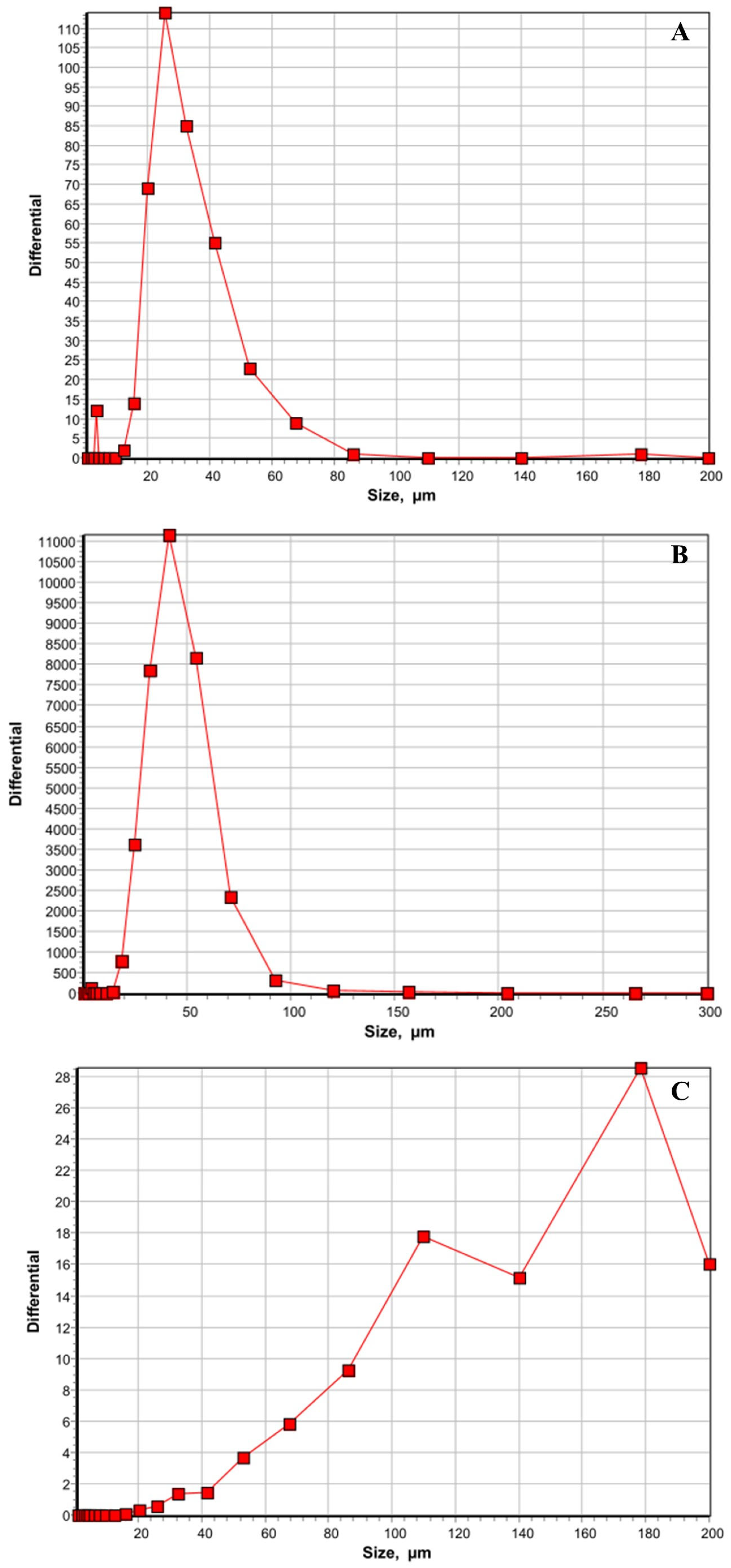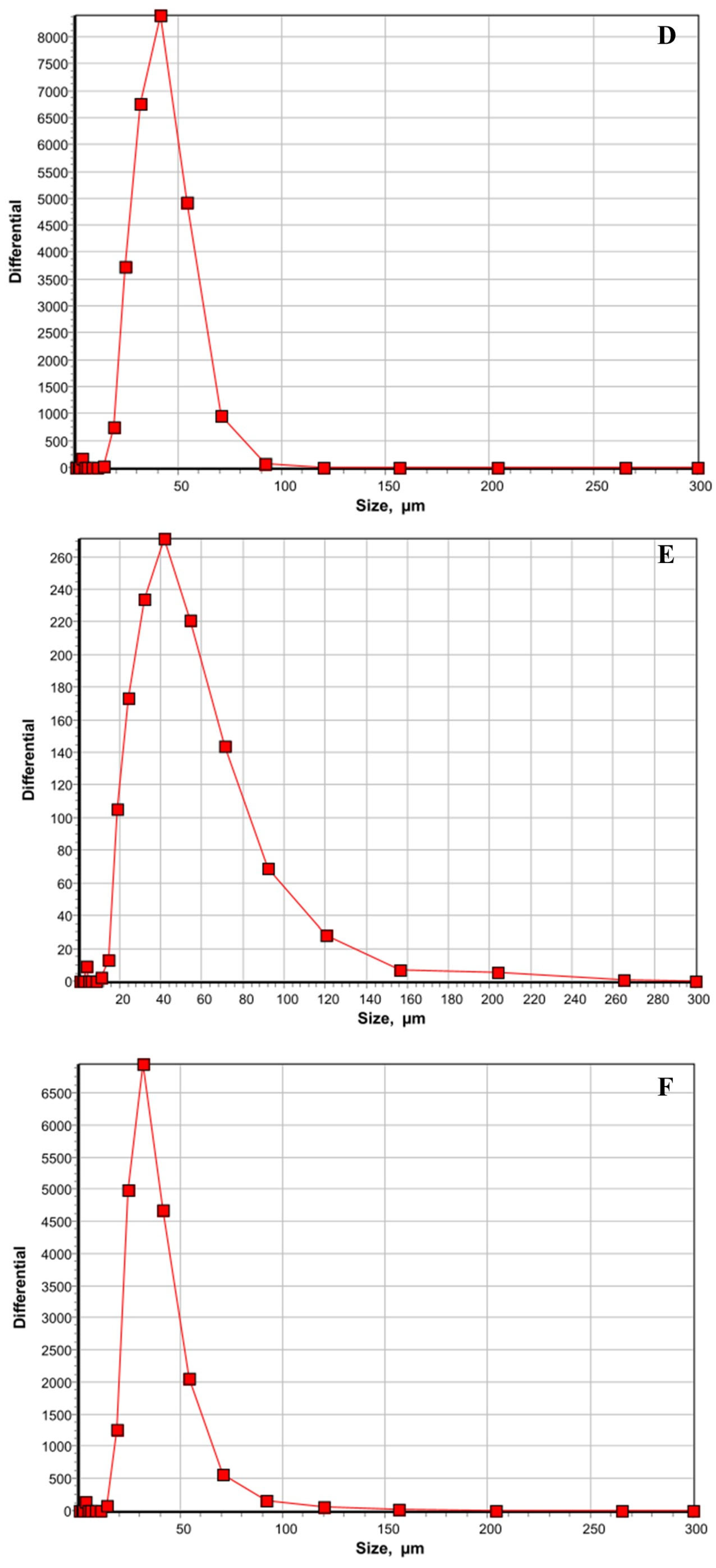 Figure 1. (AF): Determination of the particle size distributions of the treatments using a laser diffraction particle size analyzer. All the treatments were prepared in water, and the trans-cinnamaldehyde (TC) was dispersed in water using miglyol (MIG). Oxytetracycline (OTC) was directly added to the water. After 30 s of vortexing, the particle size was determined. The six treatments included were plain water (A), MIG (B), TC (C), TC+MIG (D), OTC (E), and TC+MIG+OTC (F). The size of the nanoparticles in µm is plotted on the X axis, whereas the differential is plotted on the Y axis.