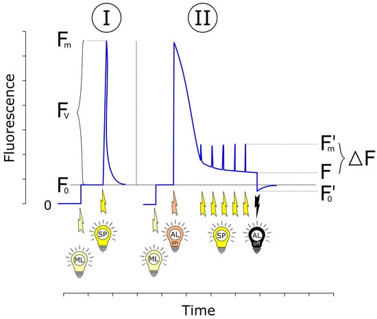 Schematic representation of the pulse amplitude modulation (PAM) method and the main fluorescence parameters (adapted from [,,]). Maximum fluorescence level (Fm) and zero fluorescence level (F0) are measured in the dark-adapted sample (with all reaction centers in the open state), using modulated measuring light (ML) followed by the saturating light pulse (Phase I). Then, the sample is illuminated with actinic light, which is able to drive photosynthesis and a series of saturating pulses to reach steady (light-adapted) state fluorescence (F′) and steady state maximum fluorescence F′m level. Finally, the actinic light (AL) and saturating pulses (SP) are switched off to measure the F′0 level of the light-adapted sample (Phase II). To measure zero fluorescence in the light phase (F′0), the sample has to be darkened and QA has to be rapidly fully oxidized. To achieve that, some instruments apply far-red light (735 nm) to enhance the selective excitation of PSI and facilitate oxidation of the electron transport chain [].