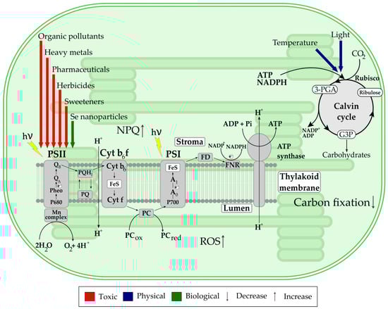 The growth-promoting role of the essential micronutrient Cu(II) in C. vulgaris is reversed as the concentration in the growth medium reaches EC50 values (effective concentration of the toxicant which induces 50% growth rate reduction) of 3.16 μM after 48 h exposure to Cu(II) []. Fv/Fm was maximal at 1 μM Cu(II) but decreased to almost zero at 4 and 5 μM Cu(II) []. The authors suggested that the negative effect of high-dose Cu(II) on the Fv/Fm may be due to Cu(II) harmful effects on the electron transport chain in PSII, indicating that the photo-damage of PSII may be accompanied by an increase in energy dissipation as heat and an increase in photo-damage to the photosynthetic apparatus []. A study on C. sorokiniana revealed that exposure to 238.2 μM of selenate (SeO42−) reduced the rate of oxygen evolution by 50%, despite no significant changes in chlorophyll or carotenoid content []. The same study reported a 25% decrease in ΦPSII for Se-exposed cultures compared to control []. Interestingly, both selenate and selenite added in sublethal doses induced partial disruption of the chloroplast ultrastructure, characterized by “fingerprint-like” rearrangement of thylakoid membranes and a reduction of normal grana stacking, resulting in a granular and less dense stroma [,,].