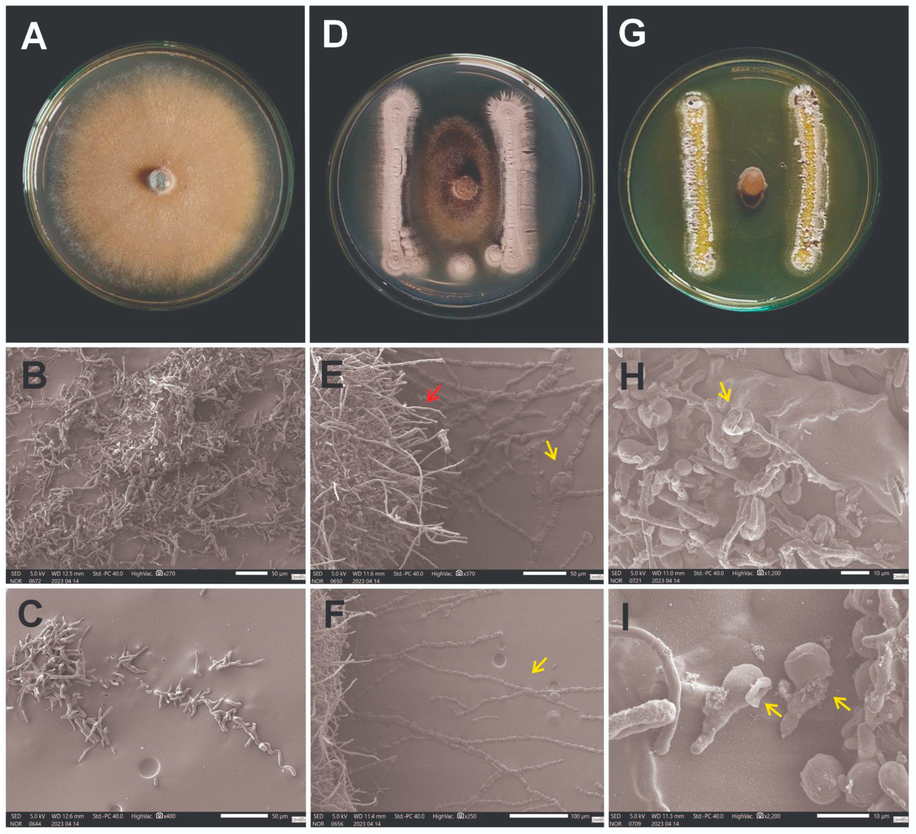 - Sousa, T.F.; Oliveira, R.; Lima, J.C.; Gomes, L.F.; Costa, P.R. Trichoderma agriamazonicum sp. nov. (Hypocreaceae), a new ally in the control of phytopathogens. Microbiol. Res. 2023, 275, 127469. [Google Scholar] [CrossRef]
