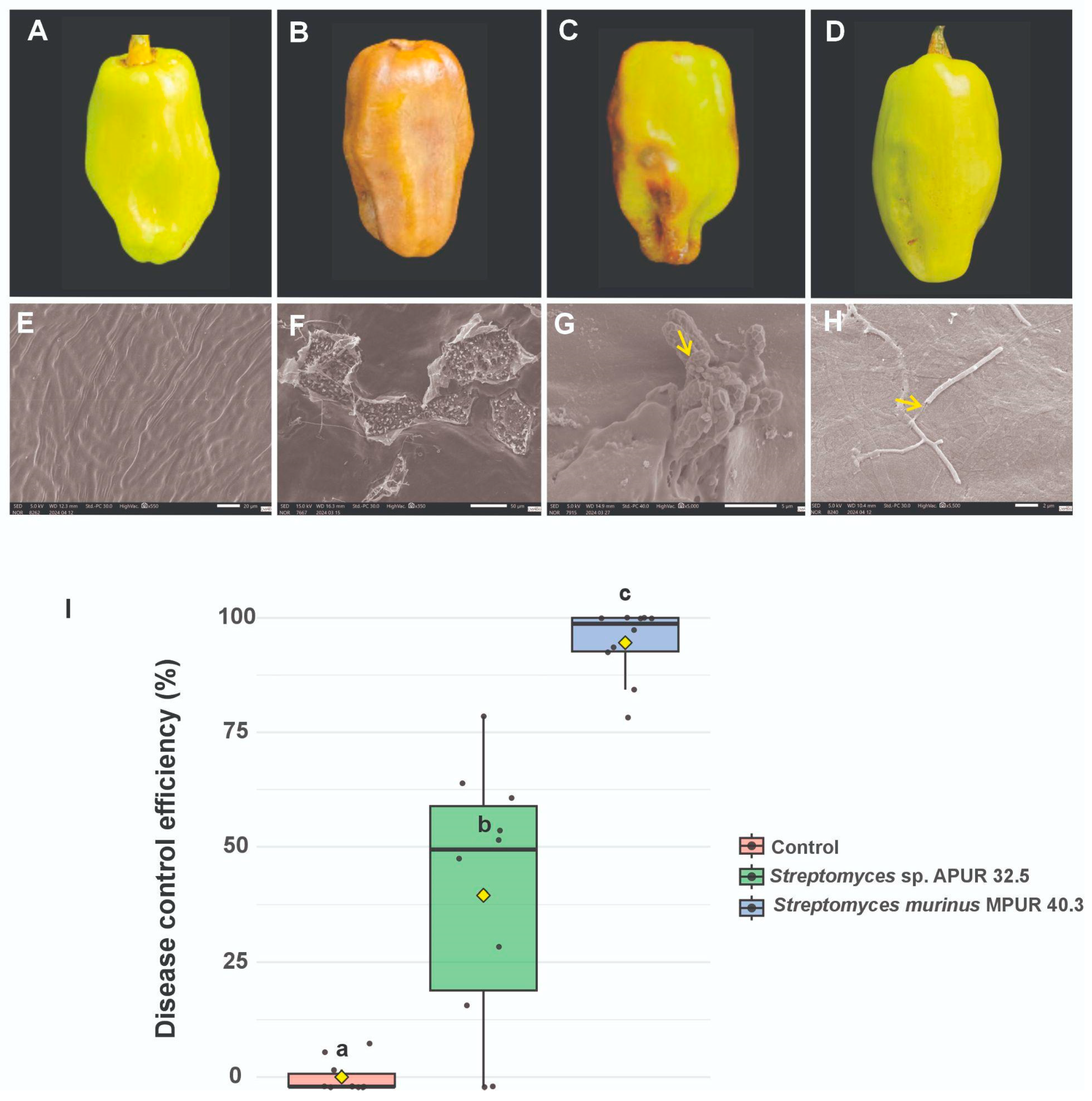 - Nguyen, H.T.; Pham, L.D.; Tran, Q.N.; Le, T.A. Biological control of Streptomyces murinus against Colletotrichum causing anthracnose disease on tomato fruits. J. Pure Appl. Microbiol. 2025, 19, 542–557. [Google Scholar] [CrossRef]