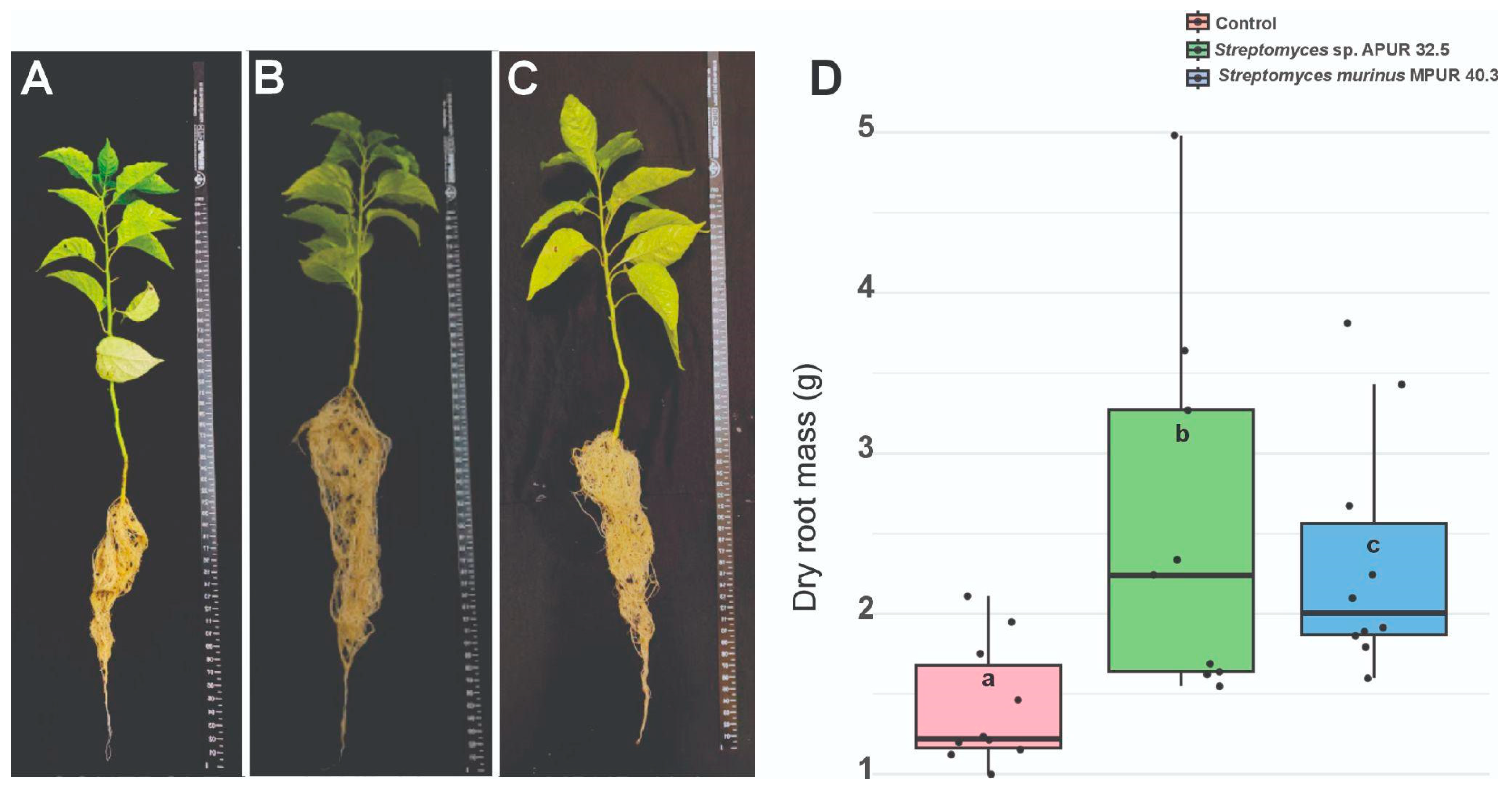 - Liotti, R.G.; da Silva Figueiredo, M.I.; Soares, M.A. Streptomyces griseocarneus R132 controls phytopathogens and promotes growth of pepper (Capsicum annuum). Biol. Control 2019, 138, 104065. [Google Scholar] [CrossRef]