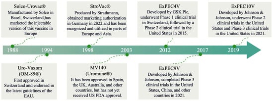 Since the advent of sulfonamides in the 1940s, antimicrobial agents, particularly antibiotics, have been employed as the primary means of addressing UTIs [23]. Nitrofurantoin experienced a significant decline in usage during the late 1970s following the introduction of newer antibiotics. However, due to the increasing resistance to fluoroquinolones and other broad-spectrum antimicrobials, nitrofurantoin—an older antibiotic with a low propensity for resistance development—has re-emerged as a first-line treatment for uncomplicated UTIs [24]. UTIs are the second most common indication for antibiotic prescription, trailing only respiratory infections in terms of frequency. This widespread use of antibiotics for UTI treatment underscores the significant burden of these infections on healthcare systems and the importance of effective therapeutic strategies. In the context of first-line therapeutic interventions, four agents are prominently recommended: nitrofurantoin, trimethoprim-sulfamethoxazole (TMP-SMX), pivmecillinam, and fosfomycin tromethamine [25,26,27]. Despite its advantages, prolonged administration can lead to severe hepatotoxicity and pulmonary toxicity, necessitating careful clinical monitoring [27]. Furthermore, nitrofurantoin exhibits limited efficacy in high-risk populations, such as pediatric and female patients with recurrent or complicated UTIs. Fosfomycin has low baseline resistance, but substantial clinical usage and demonstrated propensity for in vitro/in vivo resistance mutations constrain susceptibility rates to approximately 5–10% [28,29]. It is estimated that 30 to 60% of antibiotic prescriptions for UTIs prescriptions may not be appropriate according to current clinical guidelines, only 34% of outpatient antibiotic prescriptions for cystitis are given with the correct antibiotic, dose, and duration [30,31,32]. Multiple evidence-based guidelines formulated by prestigious international societies, such as those from the Infectious Diseases Society of America (IDSA) [33], the American Urological Association (AUA) [34], the American Academy of Family Physicians (AAFP) [35], and the American Urogynecologic Society (AUGS) [36], have delineated comprehensive pathways for the assessment and management of UTIs [23,37,38,39]. However, current clinical practice appears to deviate significantly. Multiple studies document poor adherence to major guidelines like those from IDSA, primarily through the overuse of fluoroquinolones, extended therapy duration, and underuse of first-line agents for uncomplicated UTIs [40,41,42]. These deviations, stemming from factors like diagnostic uncertainty and habitual prescribing, contribute significantly to the development of antimicrobial resistance (AMR), impacting public health and healthcare systems. It reduces treatment effectiveness, burdens healthcare, and promotes multidrug resistance, complicating disease management globally [43,44]. Vaccination offers a proactive approach to mitigate antibiotic dependence in recurrent UTIs, serving as a complementary strategy to antimicrobial stewardship [45]. This is especially valuable in clinical settings where adherence to treatment guidelines remains inconsistent, thereby helping to circumvent variability in antibiotic prescribing practices. Vaccine development should be considered as part of a multifaceted approach to UTI management, working synergistically with antimicrobial stewardship programs while addressing the limitations of current antibiotic therapies. Figure 1 summarizes the most important steps in the history of vaccines targeting UTIs.