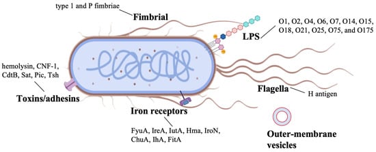 Virulence factors of uropathogenic Escherichia coli strains. The figure was created in BioRender. Baoying Wang (2025). https://BioRender.com/5kdw4yz (accessed on 20 November 2025).