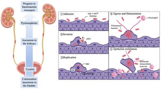 Uropathogen adhesion during UTI progression. UPEC ascends through the urethra and ureters to establish bladder infection. The pathogenesis of urinary tract infections involves UPEC attaching to bladder epithelial cells via type 1 pili. After cellular entry, bacteria use PldA phospholipase to escape endosomes and multiply in the cytoplasm, forming bacterial clusters. UPEC stabilizes HIF1 protein through cytochrome bd oxidase to inhibit cell death. Upon host cell rupture, filamentous UPEC resists neutrophil clearance. Subsequent exfoliation of superficial cells allows bacterial penetration into deeper tissues, establishing latent infection foci that cause recurrent infections. The figure was created in BioRender. Baoying Wang (2025). https://BioRender.com/dnip437 (accessed on 20 November 2025).