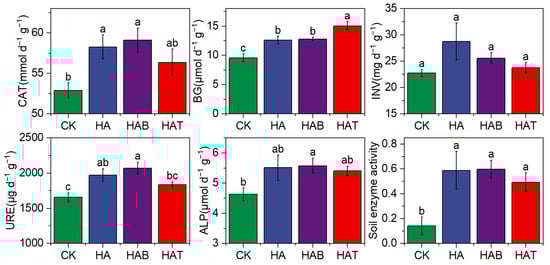 Effects of humic acid and microbial fertilizers on soil extracellular enzyme activities. CAT, Catalase; BG, β-glucosidase; INV, invertase; URE, urease; soil enzyme activity, average of standardized CAT, BG, INV, URE, and ALP. CK, control; HA, humic acid; HAB, humic acid + Bacillus subtilis; HAT, humic acid + Trichoderma harzianum. Different lowercase letters above bars indicate significant differences among treatments at p < 0.05 according to one-way ANOVA with Fisher’s LSD test.