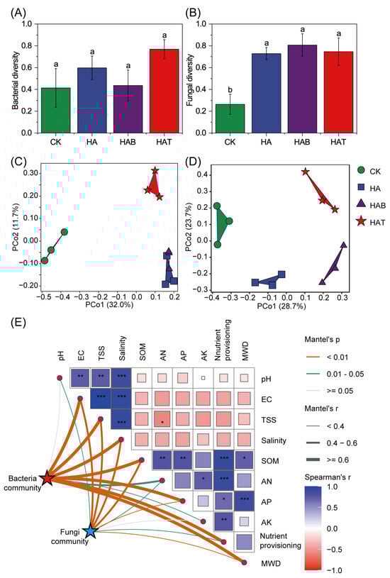 Effects of humic acid and microbial fertilizers on soil microbial diversity. (A) Bacterial diversity and (B) fungal diversity across treatments. (C) PCoA of bacterial communities and (D) PCoA of fungal communities based on Bray–Curtis distances at ASV level. (E) Mantel test showing correlations between microbial communities and soil physicochemical properties. CK, control; HA, humic acid; HAB, humic acid + Bacillus subtilis; HAT, humic acid + Trichoderma harzianum. Different lowercase letters above bars indicate significant differences among treatments at p < 0.05 (one-way ANOVA with Fisher’s LSD test). In panel (E), square size and color indicate Spearman’s correlation coefficients, *, **, and *** mark significant relationships at p < 0.05, 0.01 and 0.001, respectively. Line thickness indicates Mantel’s r. Orange, green, and gray edges represent significant relationships at p < 0.01, 0.01–0.05, and >0.05, respectively.
