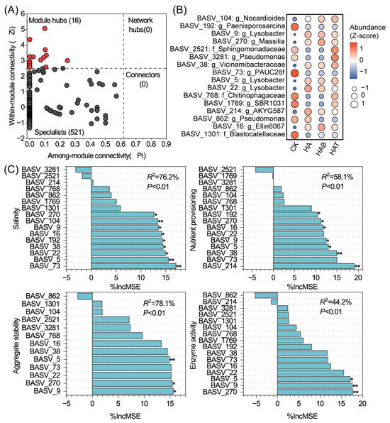 Identification of keystone taxa and their functional associations with soil properties. (A) Zi–Pi plot showing topological roles of ASVs within the co-occurrence network. (B) Heatmap of relative abundances (Z-scores) of keystone taxa across treatments. CK, control; HA, humic acid; HAB, humic acid + Bacillus subtilis; HAT, humic acid + Trichoderma harzianum. (C) Random forest analysis showing the relative importance of keystone taxa in predicting soil salinity, nutrient provisioning, aggregate stability, and enzyme activity, significance levels of each predictor are indicated by * p < 0.05, and ** p < 0.01.