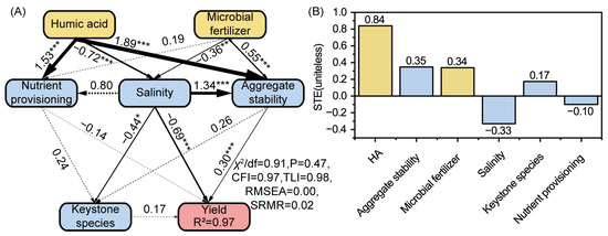 Structural equation modeling (SEM) illustrating the direct and indirect effects of humic acid, microbial fertilizers, soil properties, and keystone species on crop yields. (A) SEM showing pathways among treatments, soil salinity, nutrient provisioning, aggregate stability, keystone species, and yield. Numbers on arrows represent standardized path coefficients; solid lines denote significant relationships (* p < 0.05, *** p < 0.001), and dashed lines denote nonsignificant (p > 0.05) pathways. The model showed good fit (χ2/df = 0.91, p = 0.47, CFI = 0.97, TLI = 0.98, RMSEA = 0.00, SRMR = 0.02) and explained 97% of the variation in yield. (B) Standardized total effects (STE) of each factor on wheat yield.