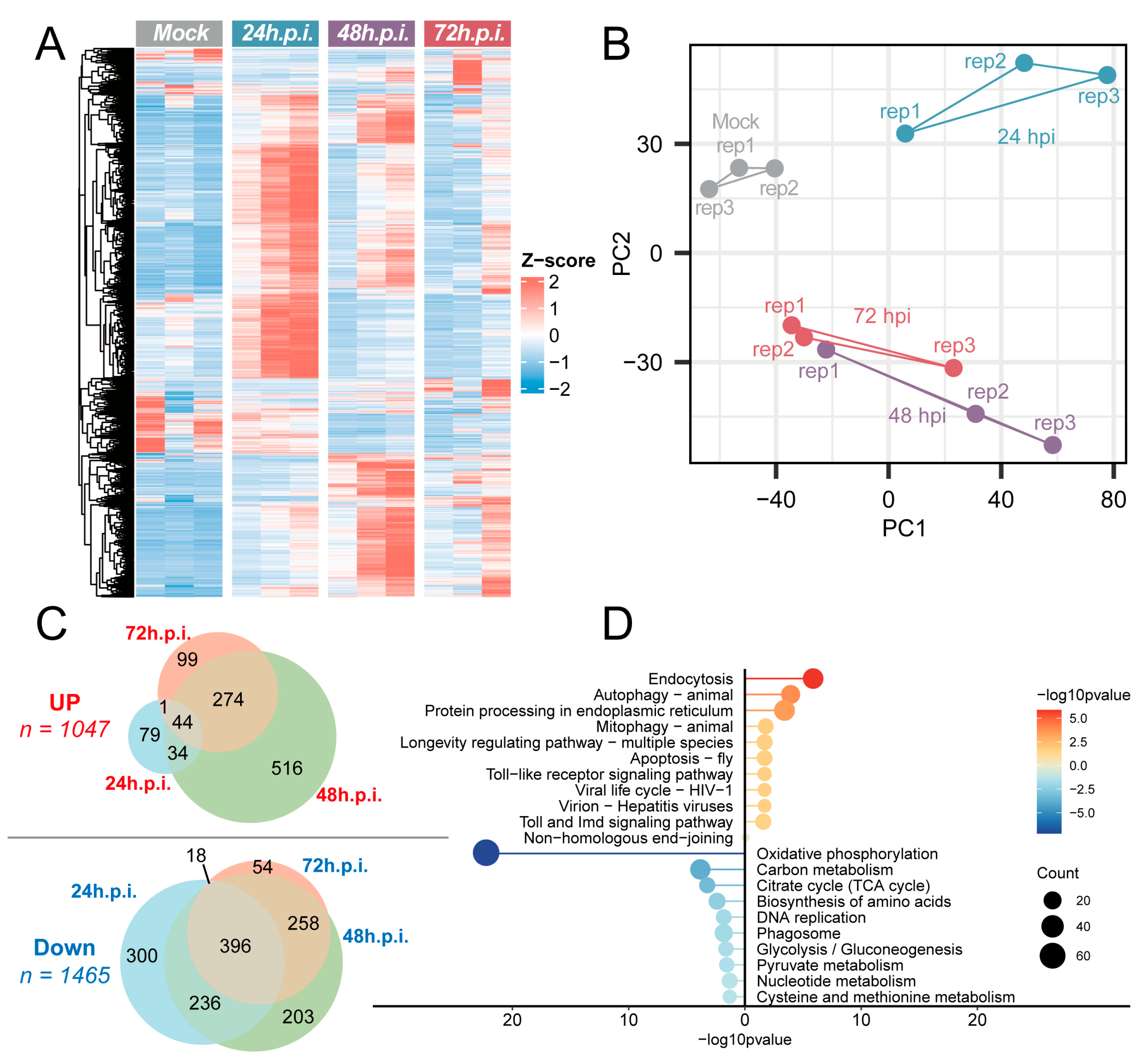 3.5. Transcriptomic Response to NX23166 (UMAV) Infection