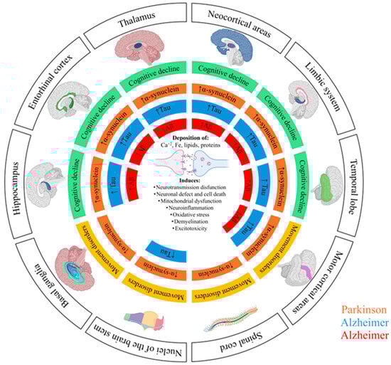 Schematic representation of the pathological progression of Alzheimer’s disease (AD) and Parkinson’s disease (PD) across different brain regions. The diagram illustrates the spatial distribution and accumulation of characteristic protein tau (Tau highlighted in blue) and β-amyloid (Aβ highlighted in red) in AD, and α-synuclein (α-synuclein highlighted in orange) in PD. These pathological protein aggregates are associated with multiple cellular processes, including neurotransmission dysfunction, neuronal loss and death, mitochondrial dysfunction, neuroinflammation, oxidative stress, demyelination, and excitotoxicity. The colored areas indicate the brain regions affected in each disease, highlighting the relationship between protein accumulation and the onset cognitive (green) or motor symptoms (yellow).