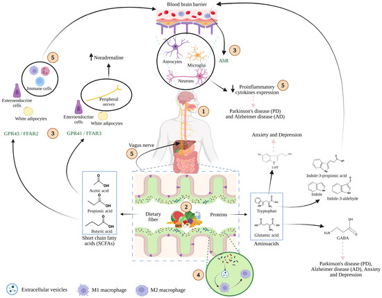 Schematic representation of the microbiota–gut–brain axis. (1) Food intake delivers key nutrients, including carbohydrates, lipids, proteins, vitamins, and minerals that are metabolized not only by the host but also by gut microbiota. (2) Microbial fermentation of these macronutrients generates bioactive metabolites such as short-chain fatty acids (SCFAs) and amino acid derivatives. (3) These compounds interact with specific host receptors, including G-protein-coupled receptors (GPR43/FFAR2, GPR41/FFAR3) and the aryl hydrocarbon receptor (AhR), which are expressed on epithelial, immune, and neural cells. (4) Extracellular vesicles derived from microbiota play a pivotal role in macrophages modulation. (5) Through these interactions, microbial metabolites trigger intracellular signaling cascades, modulate immune responses, and influence central and peripheral processes involved in health and disease. Adapted from [62,63,64]. Created with BioRender.com (2025) (accessed on 17 November 2025).