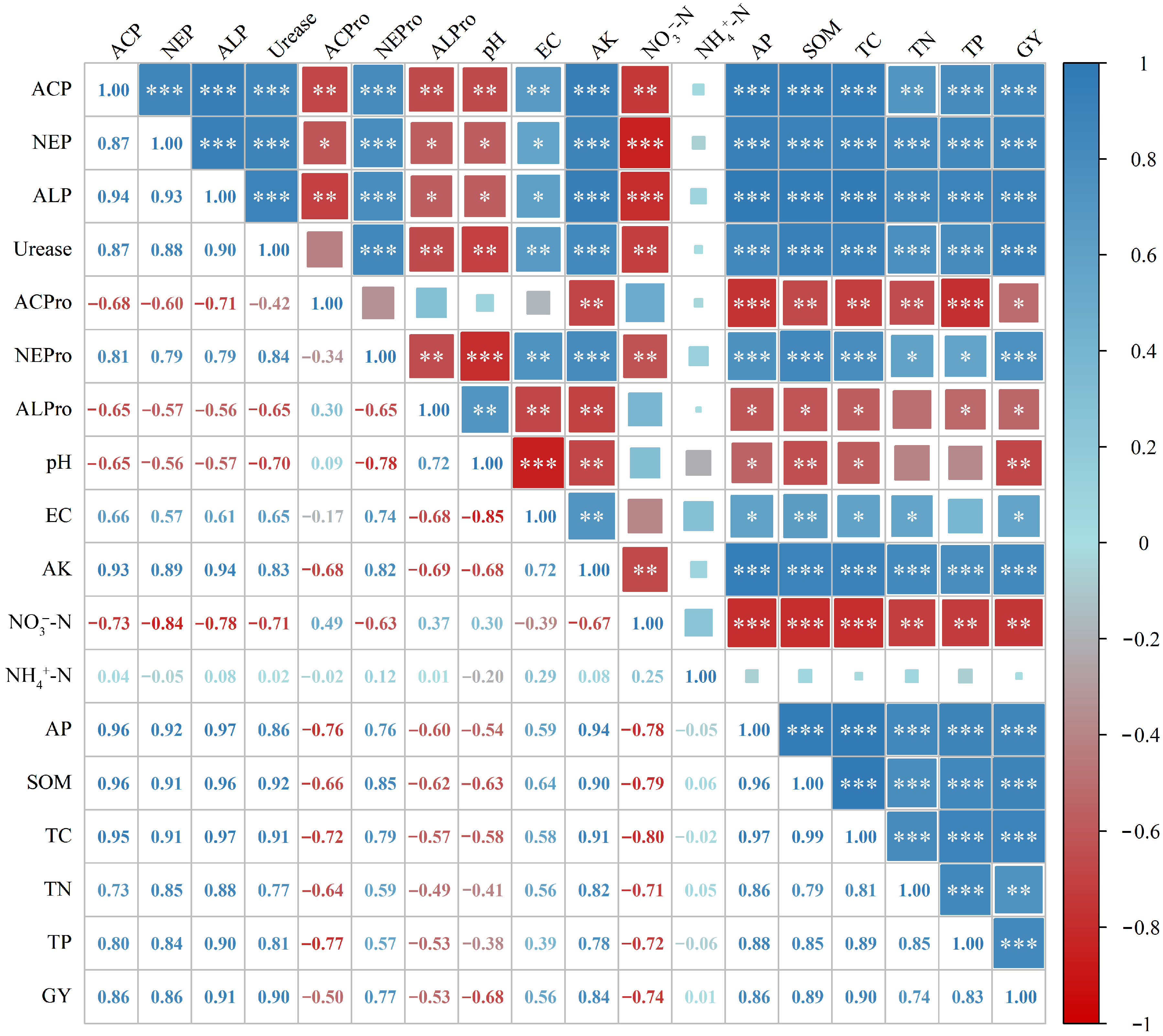 3.5. Correlation Analysis of Soil Properties and Faba Bean Yield with Soil Enzyme Activities