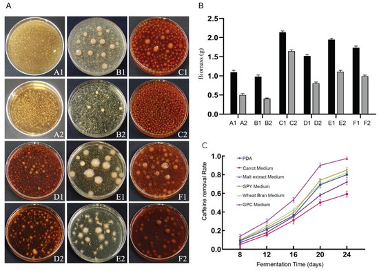 (A) Growth of D. tabescens on six liquid media. (B) Statistics of mycelial biomass (dry weight) of D. tabescens in six liquid culture media. (C) Statistics on Caffeine Degradation by D. tabescens in Six Liquid Culture Media. Note: A1: PDA medium; A2: PDA caffeine enriched medium; B1: carrot medium; B2: carrot caffeine enriched medium; C1: malt extract medium; C2: malt extract caffeine enriched medium; D1: GPY medium; D2: GPY caffeine enriched medium; E1: wheat bran medium; E2: wheat bran caffeine enriched medium; F1: GPC medium; F2: GPC caffeine enriched medium.