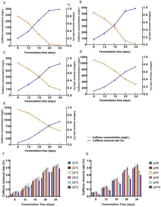 (A–E) Caffeine degradation by D. tabescens in different caffeine concentration (mg/L). Caffeine concentration (A) 300 mg/L; (B) 600 mg/L; (C) 900 mg/L; (D) 1200 mg/L; (E) 1500 mg/L. (F) Caffeine removal rate by D. tabescens at different temperature conditions. (G) Caffeine removal rate by D. tabescens under different pH conditions.