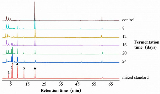 Calibration of caffeine and its metabolites in D. tabescens at different fermentation times. Note: 1. xanthine; 2: 7-methylxanthine; 3: 3-methylxanthine; 4: theobromine; 5: theophylline; 6: caffeine.