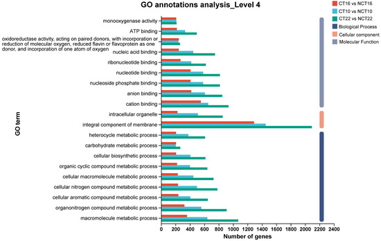 For GO enrichment analysis, which aimed to elucidate DEG functions, ~72–77% of DEGs across all three caffeine-treated vs. control groups (CT10 vs. NCT10, CT16 vs. NCT16, CT22 vs. NCT22) were assigned to the three core GO domains: biological process (BP), cellular component (CC), and molecular function (MF). Notably, consistent with the demands of caffeine degradation, the dominant subcategories across all comparisons were “metabolic process” and “cellular process” in BP (reflecting active catabolic activity), “membrane part” and “cell part” in CC (linked to substrate transport and enzyme localization), and “catalytic activity” and “binding” in MF (key for enzymatic reactions), while specific counts of DEGs assigned to each subcategory are provided in Figure 5.